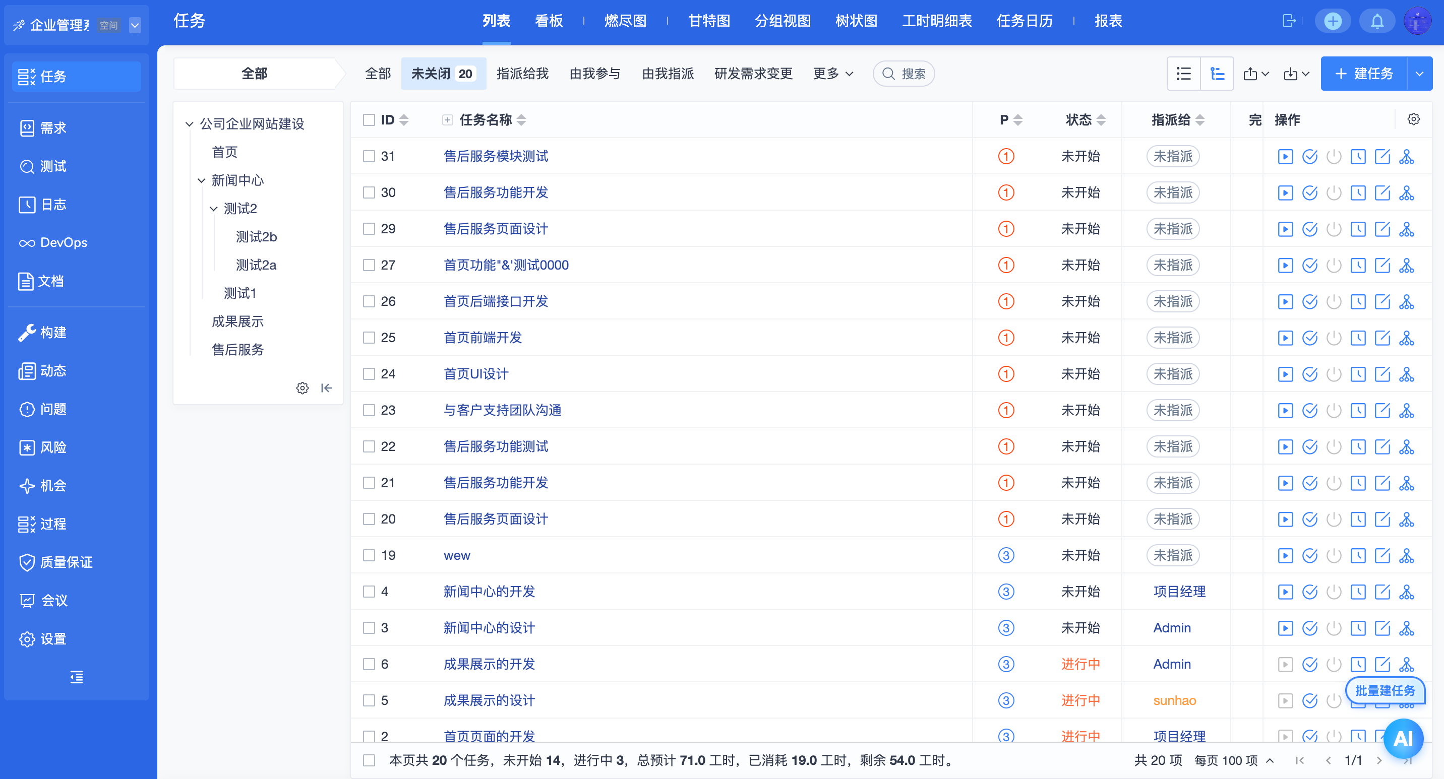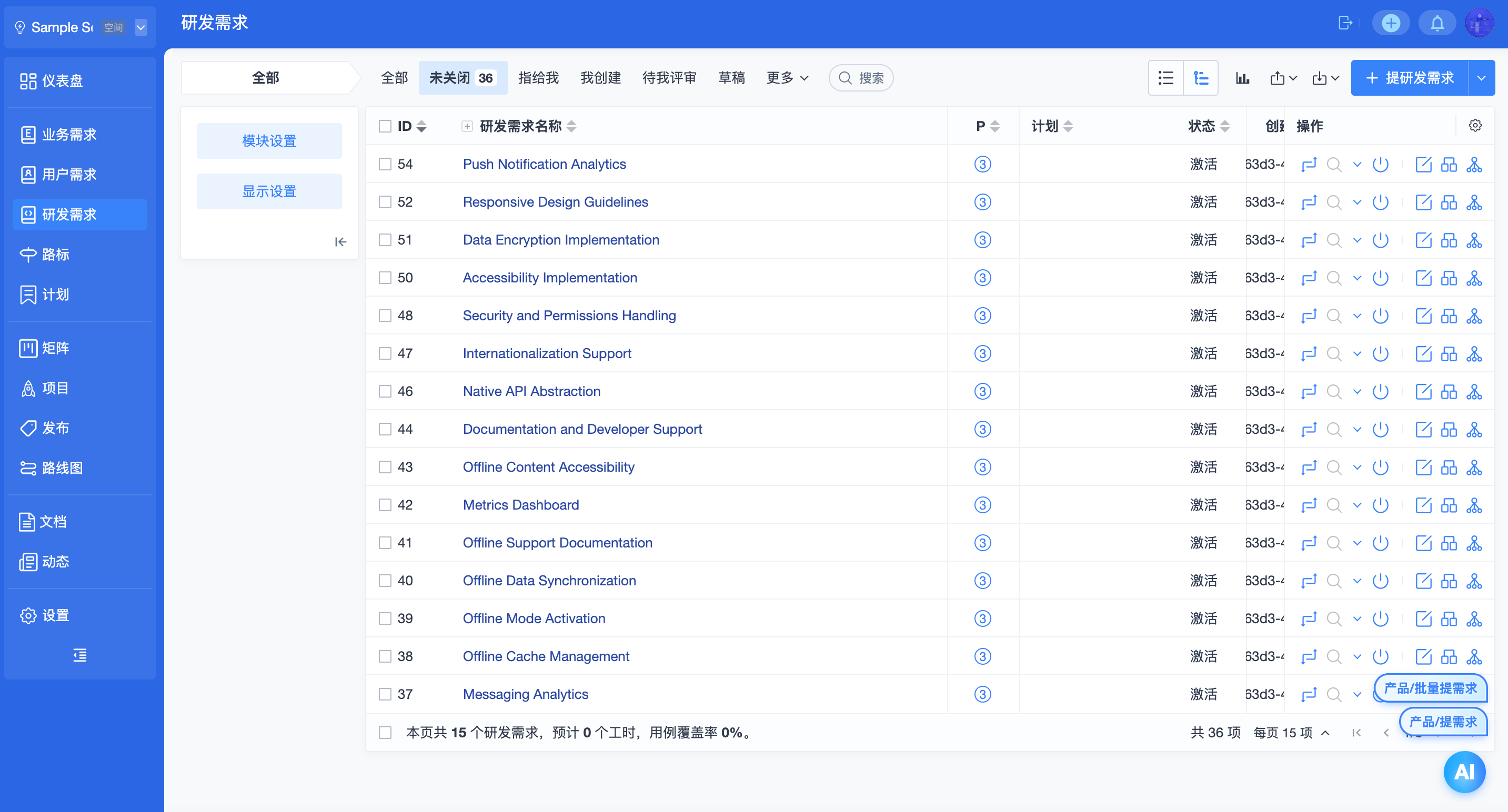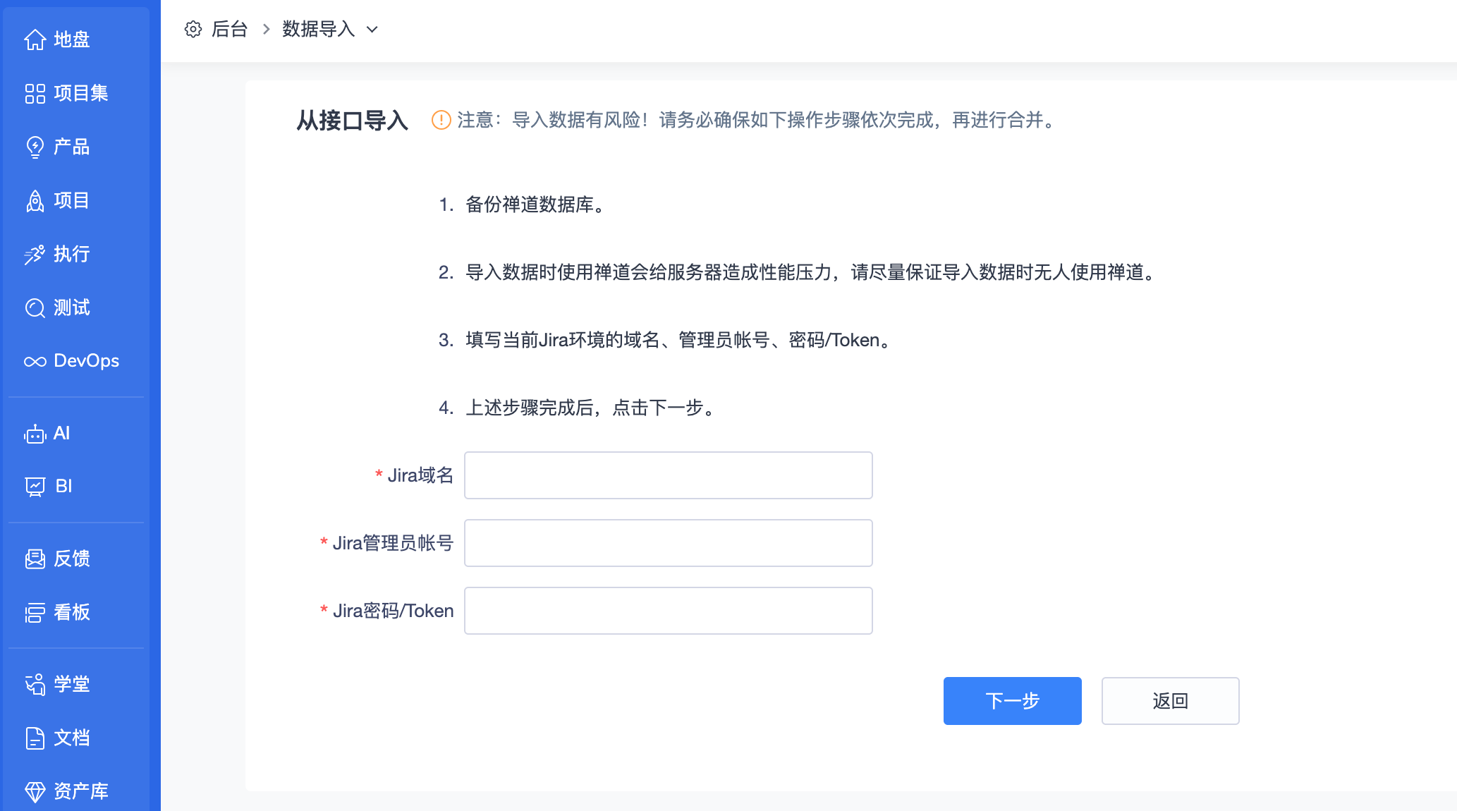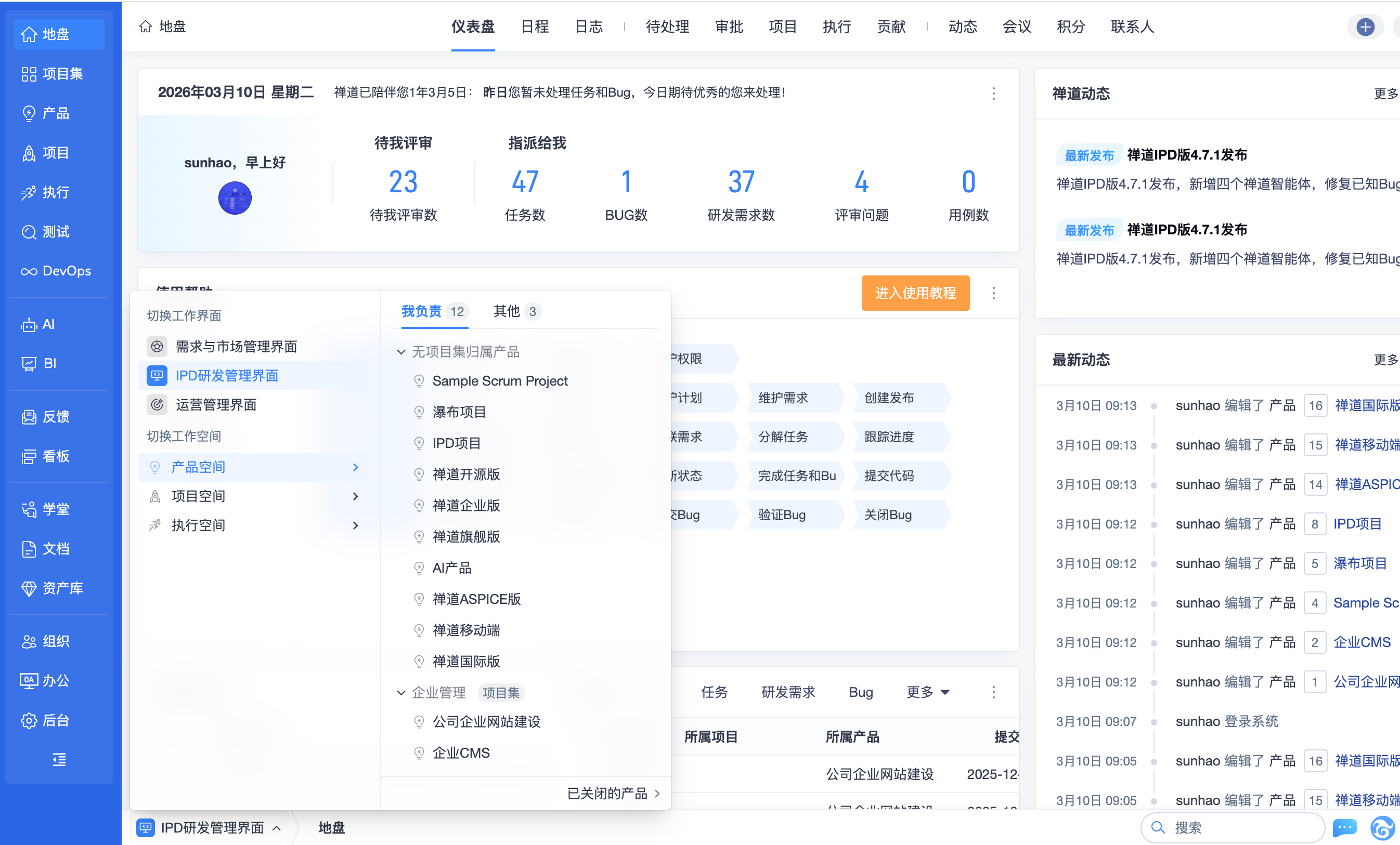 ▼后台功能开关中增加更多可选功能:项目集、套件、用例库、AI、BI、自动化。