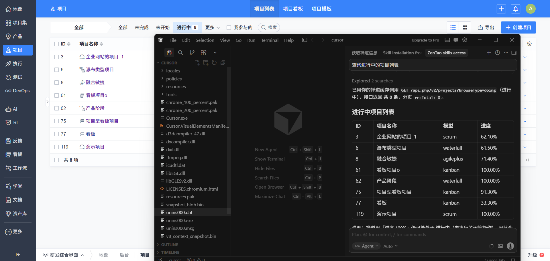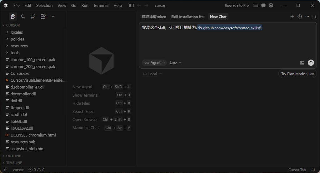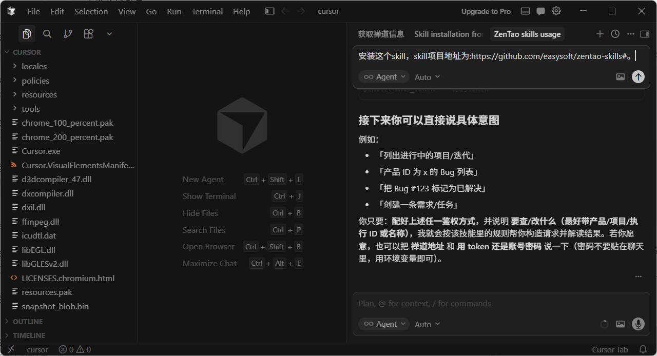 或者将如下内容发送给 Cursor、Claude Code等会话:安装这个Skill,Skill项目地址为:https://github.com/easysoft/zentao-skills#。