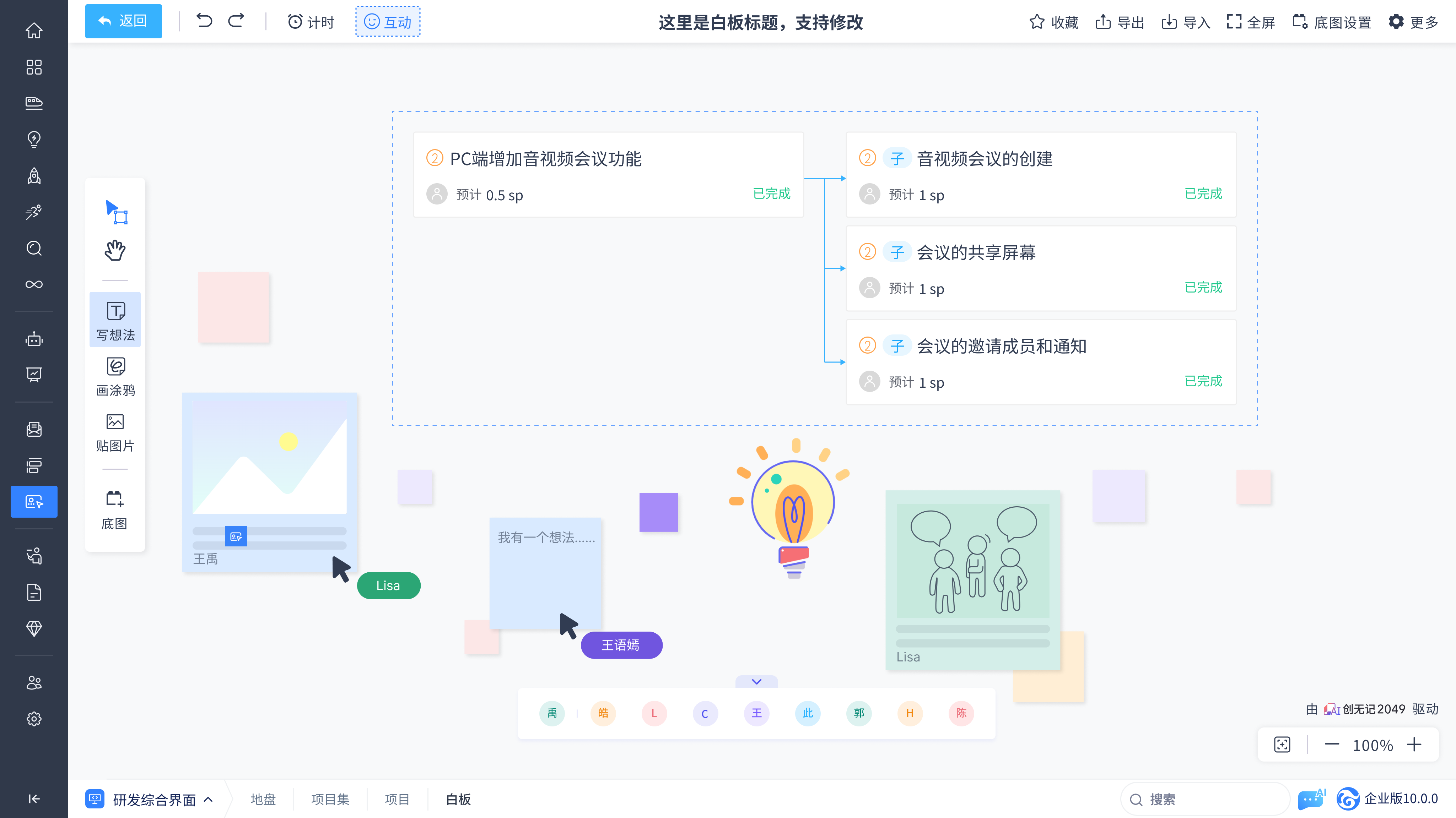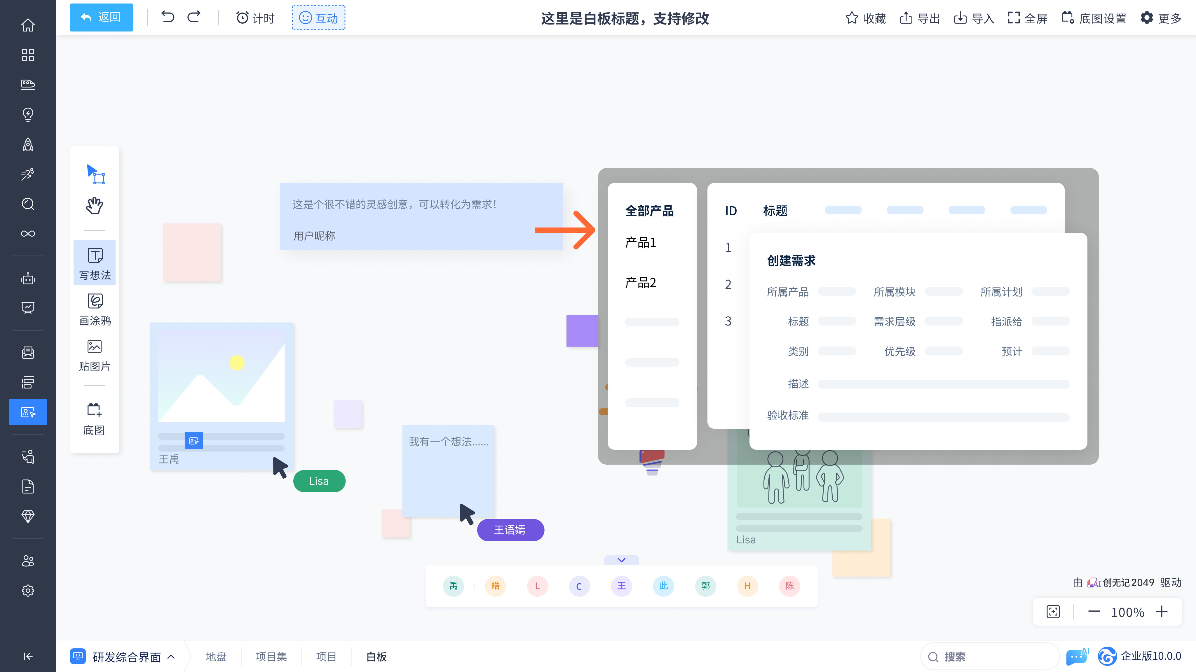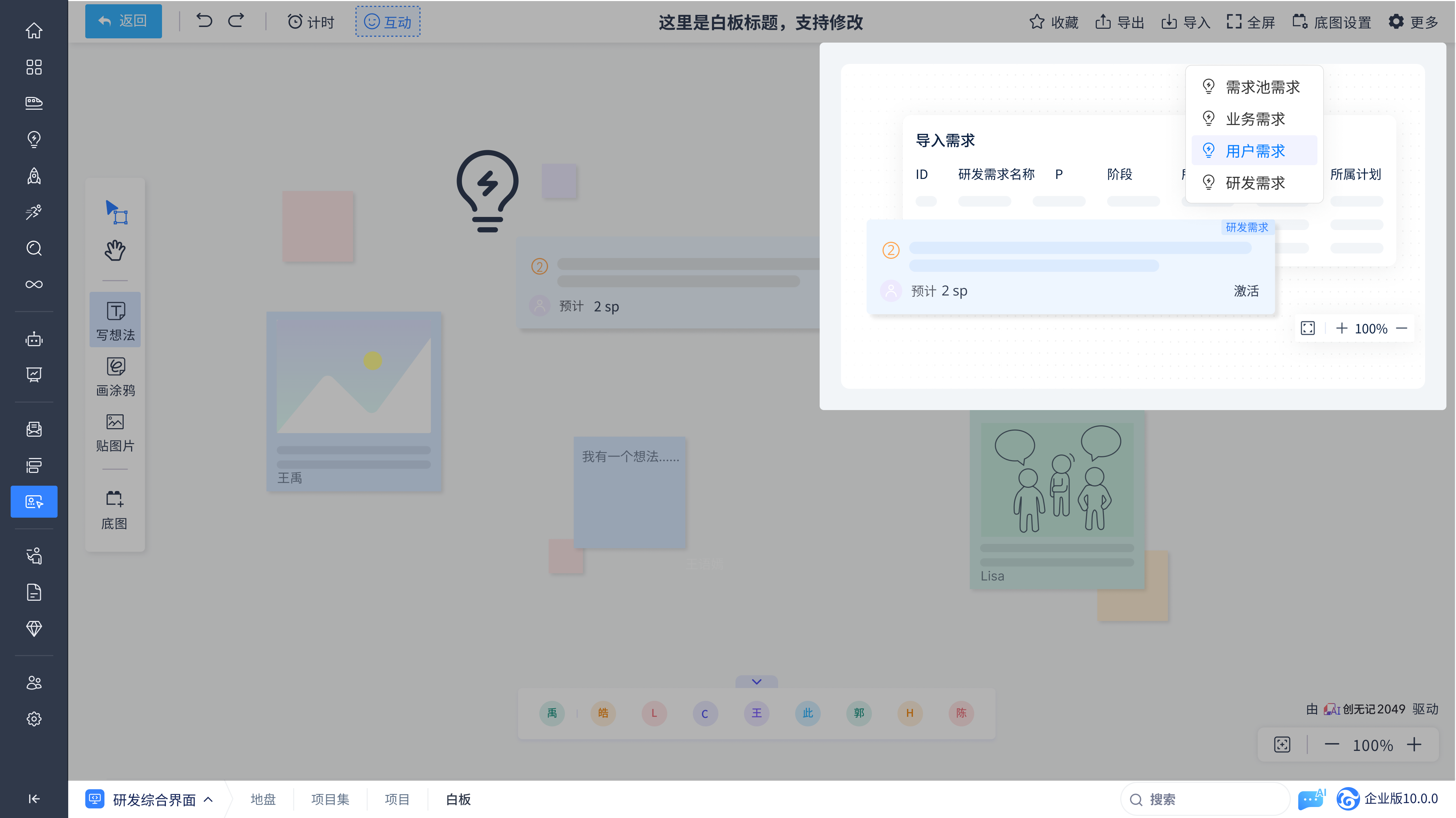 - 支持便签转化为禅道需求:白板中的便签可以一键转化为禅道需求,将想法内容同步为需求标题,顺畅连接团队创意与执行流程。