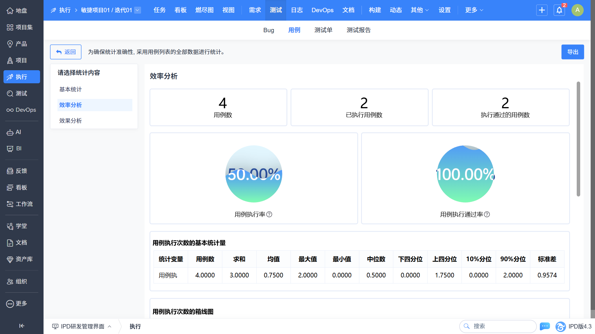 - 执行用例列表效率分析:实时统计用例执行率、通过率与用例执行次数,保证测试覆盖与用例质量。