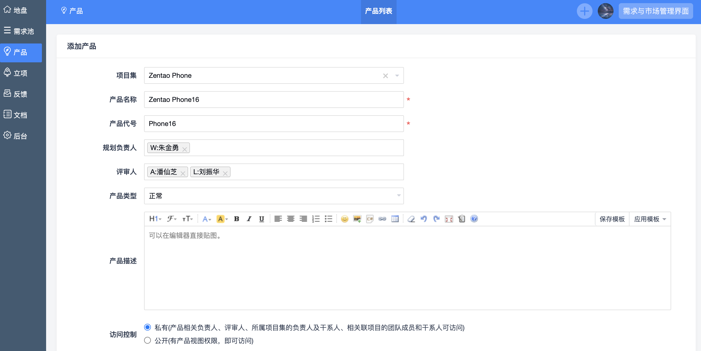 ▼ 创建产品,设置产品规划负责人、评审人、产品类型