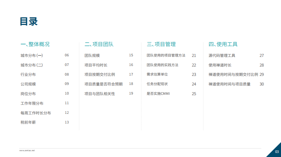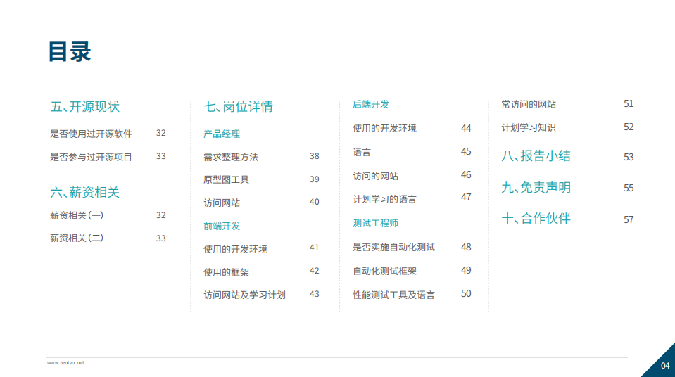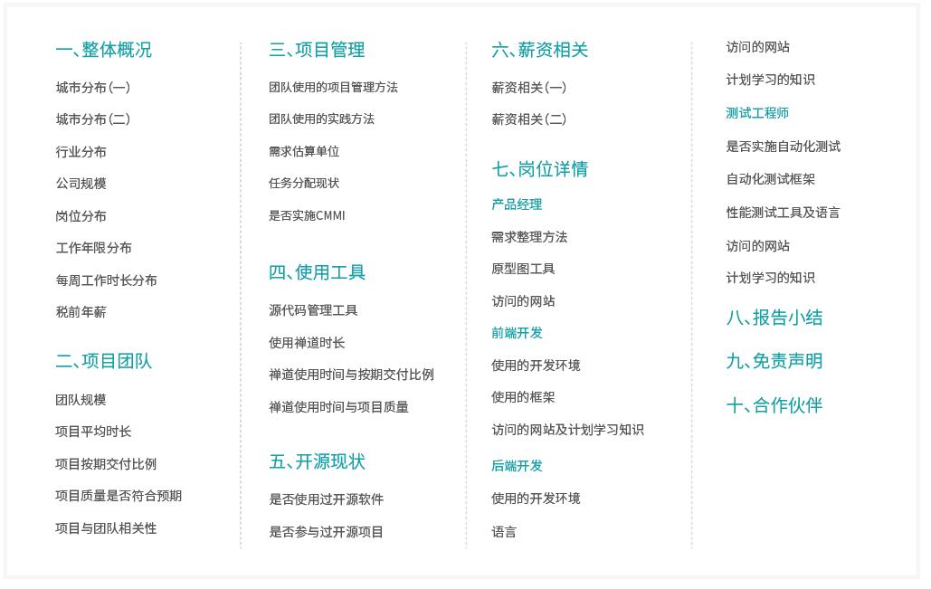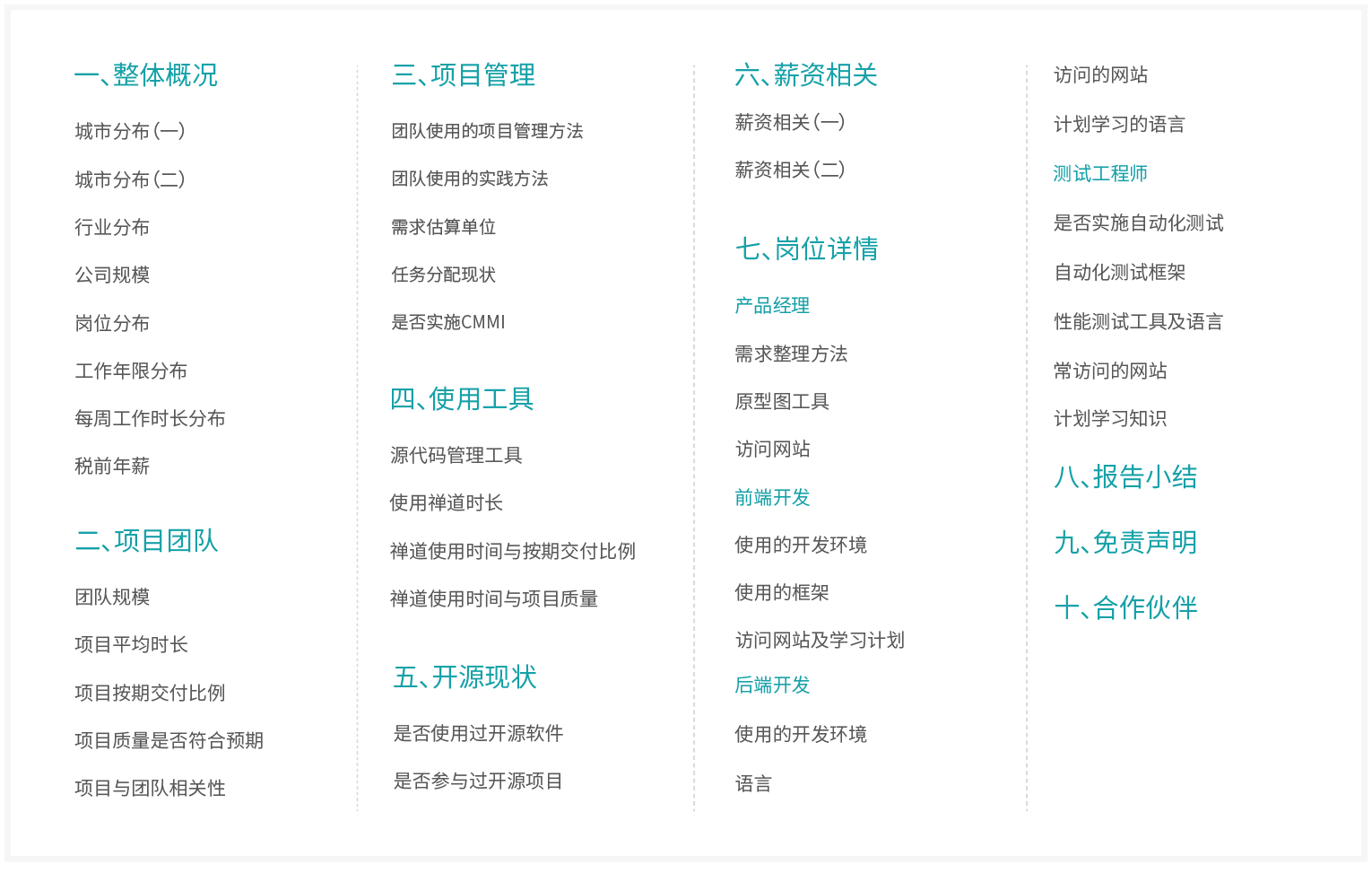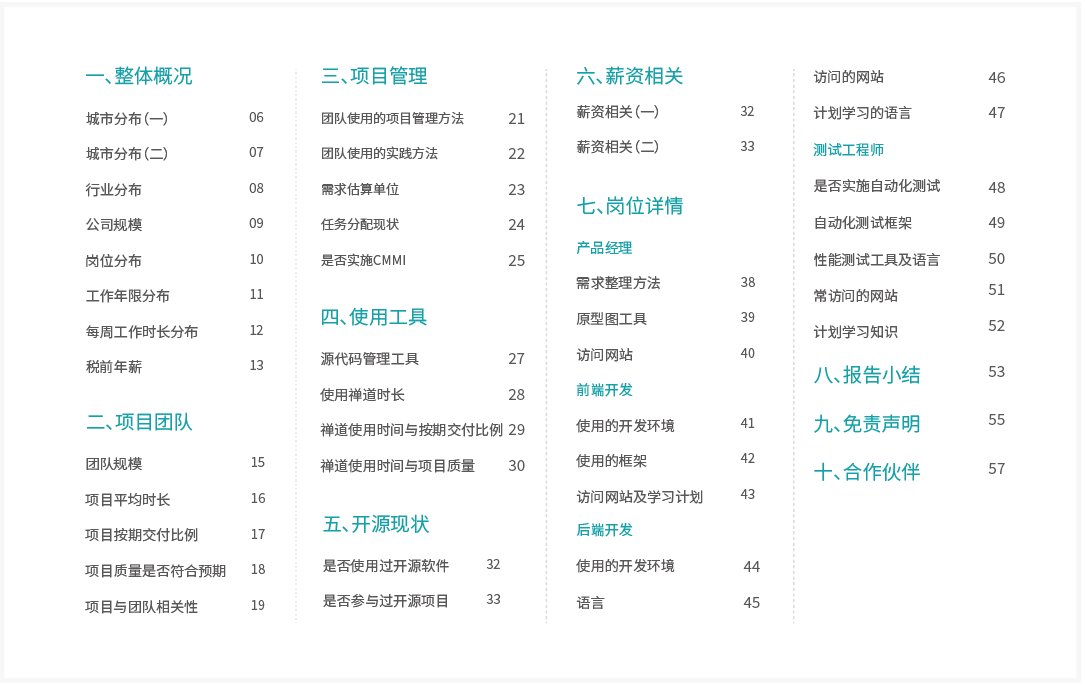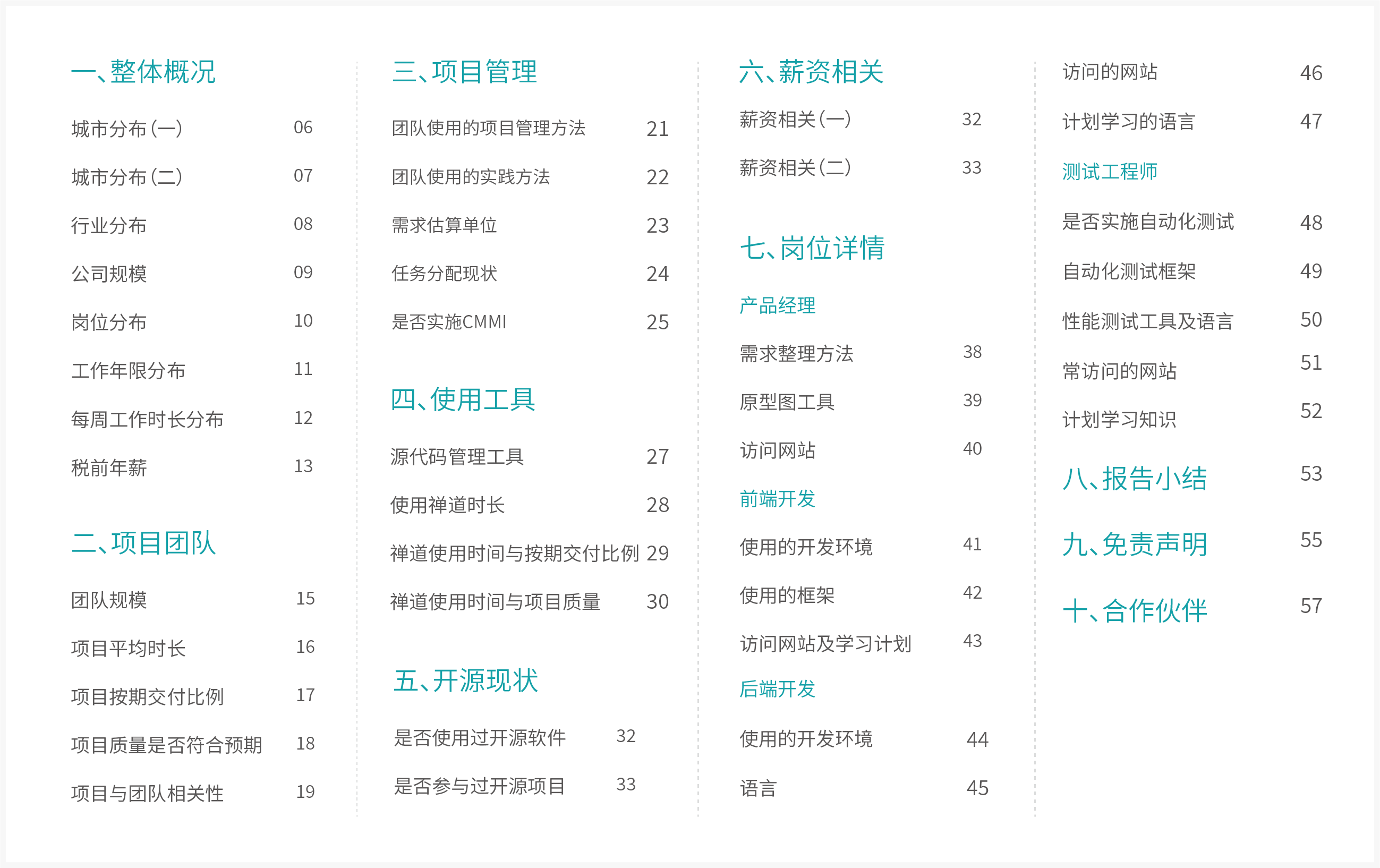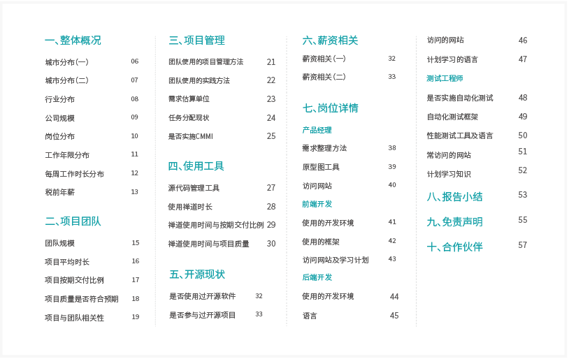 《报告》共58页,分为十个板块,涉及薪资、项目交付时间、项目质量、开源现状、使用工具、各岗位详情等结论,具体框架如下: