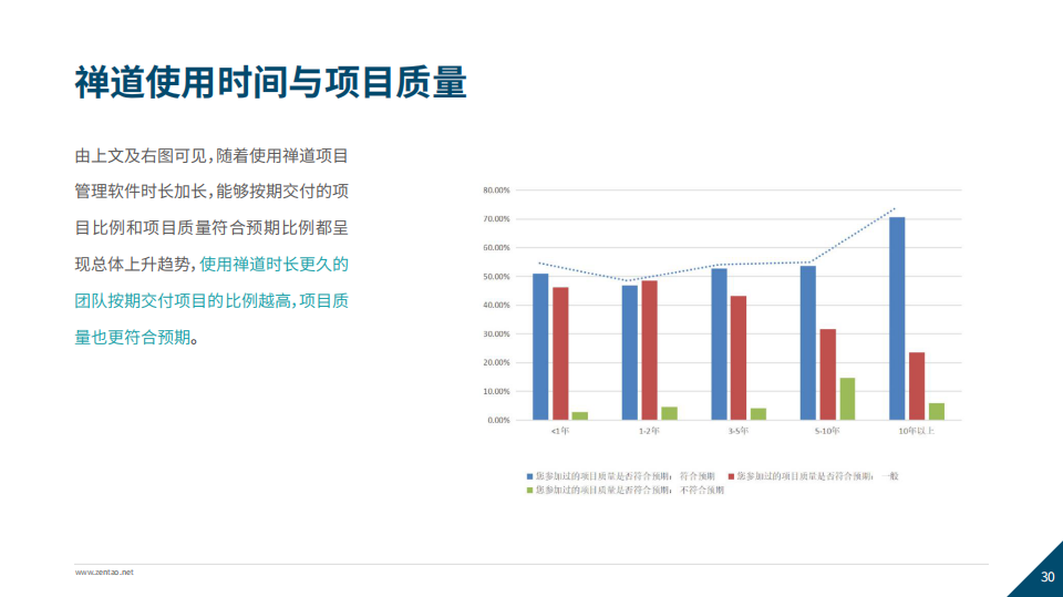 问卷收集有效数据为545份,受访者横跨多个城市、行业、岗位、年龄,保证全面性的同时可体现不同层面的多样性。《报告》从地域、行业、公司规模、岗位等入手,在项目团队、项目管理、使用工具、薪资待遇等方面展开分析,同时,针对不同选项等进行相关性分析,通过数据得到项目交付、项目质量与团队、行业、实践方法、使用工具等相关性结论。通过使用禅道项目软件的时长与项目交付时间、项目质量的分析,可得出结论:禅道可显著提高项目交付比例及项目时间。