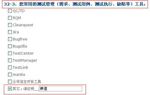 在调查文件的第三页,32-3问题,如果您正在使用禅道,请勾选其他,然后填上禅道。