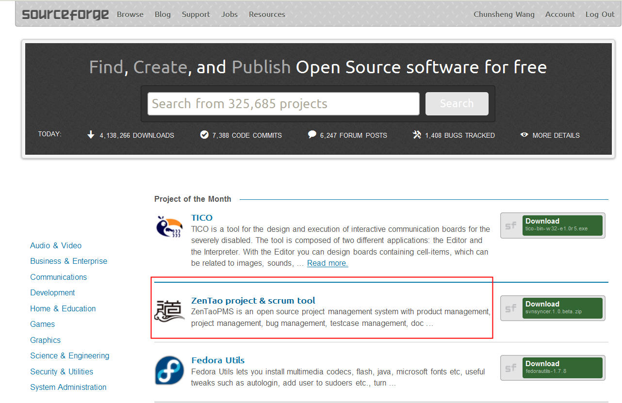 今天早上收到Rich Bowen发来的一封email,大意是禅道项目由于过去两个星期的下载量和项目的访问量,被推荐为sourceforge.net当月的推荐项目,展示在sf.net的首页。一开始有点意外,访问了下sf.net首页,果然禅道排在了第二位!这算是一个意外的惊喜吧,呵呵,虽然有点搞不明白sf.net的推荐机制。上图。