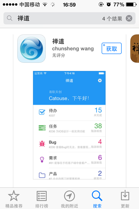 大家可以使用Iphone、Ipad,在App Store里搜索“禅道”,获取禅道app,安装使用。
