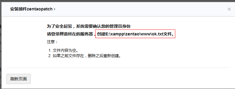 2、为了安全起见,需要你在服务器创建一个空文件,以便证明你的管理员身份。创建后点击“刷新页面” 。