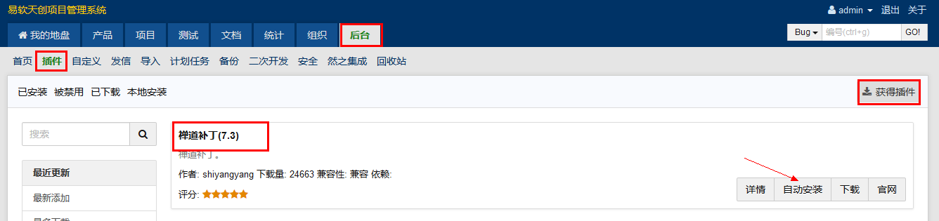 1、到禅道 后台->插件 页面,点击“获取插件”链接,找到“禅道补丁”插件,点击“自动安装 ”链接