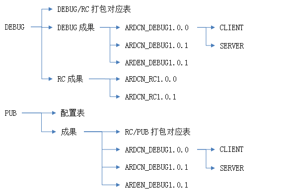 在DEBUG和RC版本中,打包主要用于验证需求开发,而不需要做线上的维护,因此版本配置文件管理需要主要集中在游戏本身的配置文件,多个版本之间可以不增加VERSION CODE和资源版本号等文件。而打包对应表需要保存DEBUG和RC打包成果的对应关系。