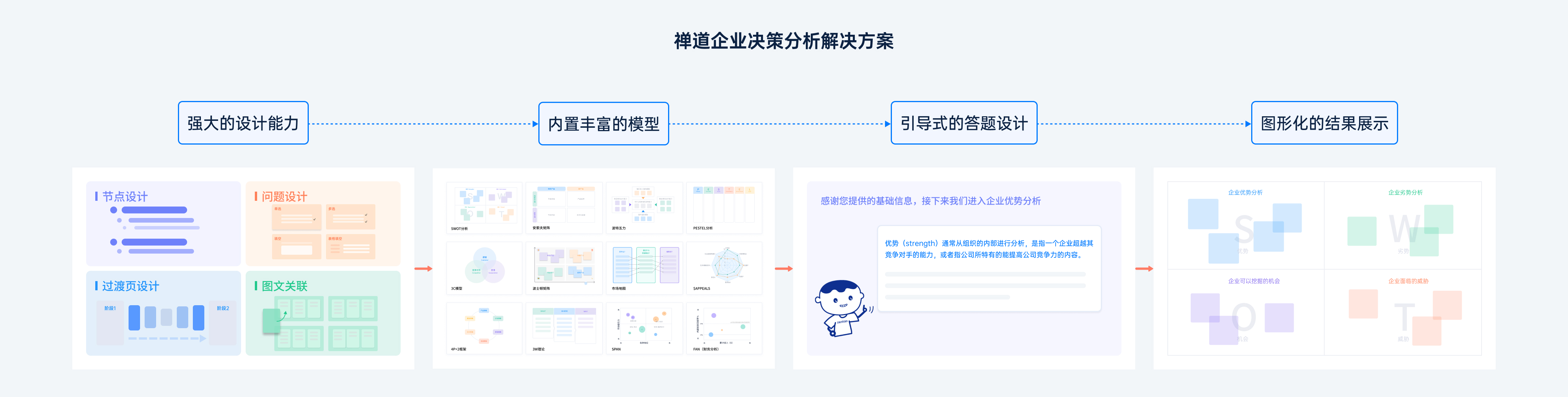 2024年,禅道创新发布了「企业决策分析解决方案」,并实现了从1.0版本到3.0版本的全面升级,禅道企业决策分析解决方案集成了$APPEALS模型、3C战略三角模型、安索夫矩阵模型、SWOT、PESTEL、波特五力、4P营销管理等,可以帮助企业全面了解自身状况和外部环境,更好地制定战略决策、规划业务发展方向,预测市场趋势和风险。采用问答式引导方式,将抽象的模型和方法转化为易于理解的形式,帮助企业科学地做好分析决策。