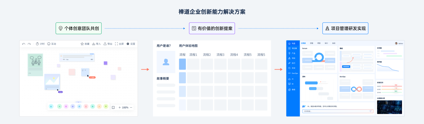 2024年,禅道发布了「企业创新能力解决方案」,以团队白板的形式呈现,实现多人在线协作和实时保存,白板提供无限画布、丰富的创作元素和趣味互动模式,以满足各类使用场景和管理需求。无论是方案共创、调研分析还是其他创意类工作,禅道企业创新能力解决方案都能为企业提供帮助。