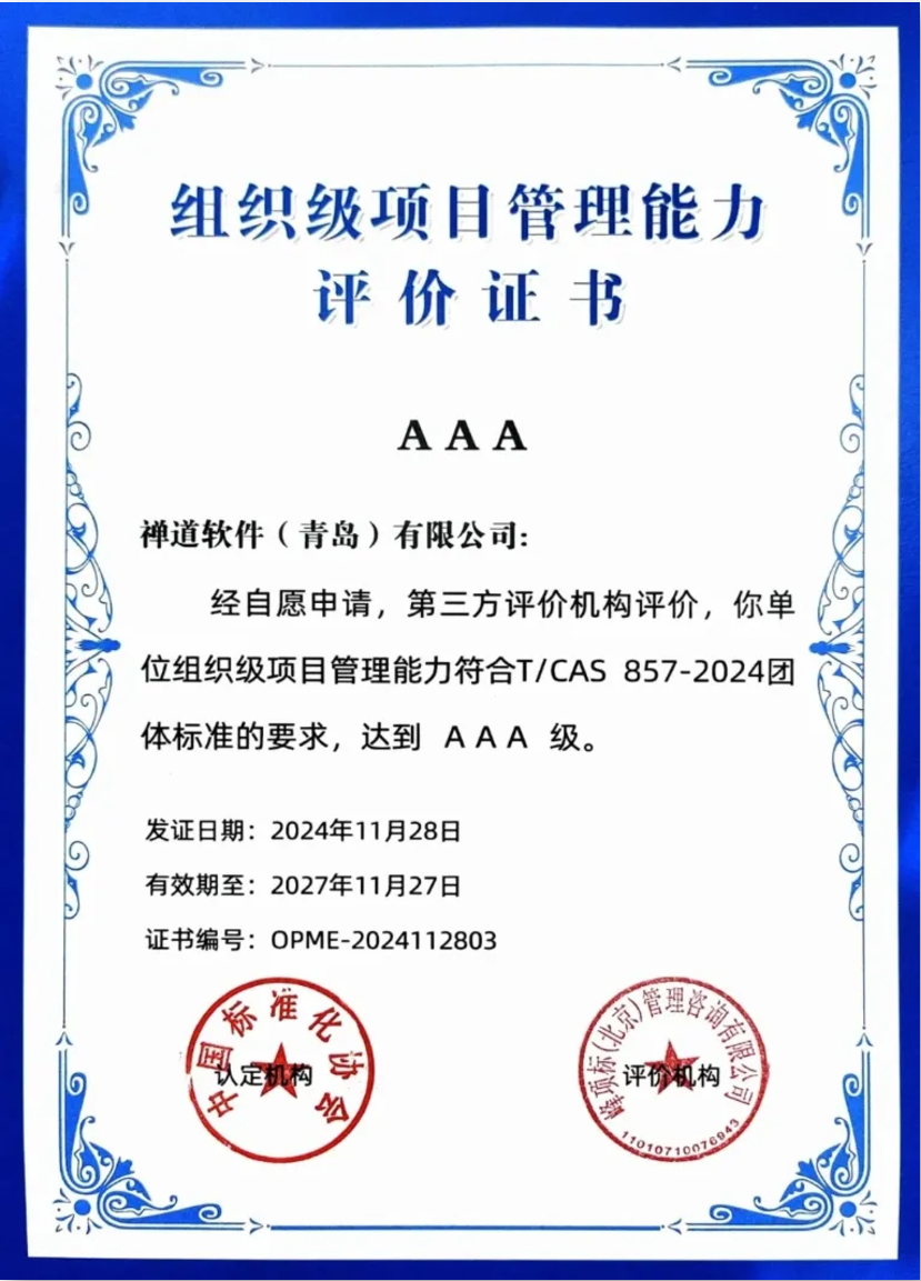 2024年,11月30日至12月1日,由中国标准化协会主办、华为技术有限公司协办的首届项目管理标准化大会在上海圆满闭幕!禅道项目管理软件第一时间申请能力评估,经第三方评价机构严谨评价后,顺利获得了组织级项目管理能力3A级证书,并授予禅道「项目管理专业人员培训授予机构」证书。
