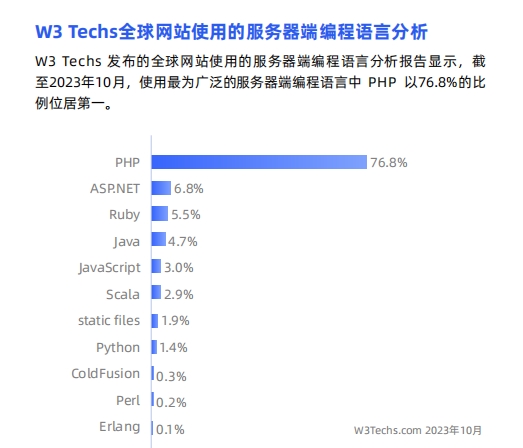 为拨开PHP语言周遭的层层迷雾,禅道项目管理软件团队从近两年各方发布的PHP应用现状报告、2023年PHP最新动态以及对PHP社区用户的深入访谈等维度出发,整理编辑出了一份全面、真实、客观的《2022-2023年度PHP综合现状分析报告》。希望这份报告能帮助行业从业者更好地理解PHP语言的现状与趋势,为相关决策提供参考依据。在PHP的应用方面,WakaTime发布的年度使用数据显示,2022年使用较为广泛的编程语言中,PHP以11%的比例位居第三;SlashData公司发布的2022年开发者报告显示,在过去24个月内,PHP的社区排名相对稳定在第五、六名;W3 Techs发布的全球前1000万个网站的编程语言分析报告显示,截至2023年8月,使用最为广泛的服务端编程语言中,PHP以76.8%的比例位居第一……PHP语言的应用现状还是呈整体稳定的形势。