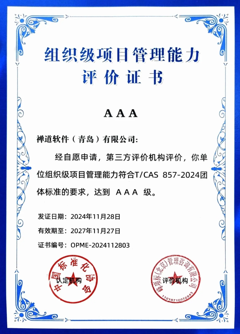 2024年4月,中国标准化协会正式发布并实施《 组织级项目管理能力评价指南》。如今,项目管理能力已成为衡量一个组织综合实力和竞争力的重要指标。在《组织级项目管理能力评价指南》发布实施后,禅道项目管理软件第一时间申请能力评估,经第三方评价机构严谨评价后,顺利获得了组织级项目管理能力3A级证书。