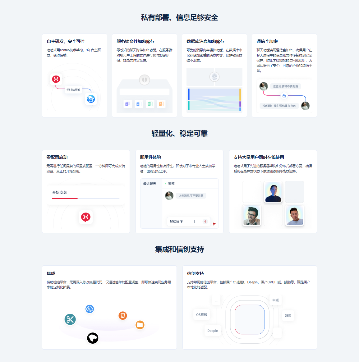 喧喧即时通讯软件提倡开放、轻量、跨平台、可私有部署的理念,依托zentao技术架构打造了全私有部署的企业即时聊天工具。喧喧即时通讯软件全程100%独立自主研发,实现服务端文件加密储存,数据库消息加密储存,通信全加密,为用户提供安全可控的国产信创交流工具,采用了先进的服务器架构和分布式部署方案,确保系统在高并发状态下依然能够保持高效运转。借助喧喧平台,无需深入修改底层代码,仅通过简单的配置调整,即可快速实现业务需求的定制化扩展。