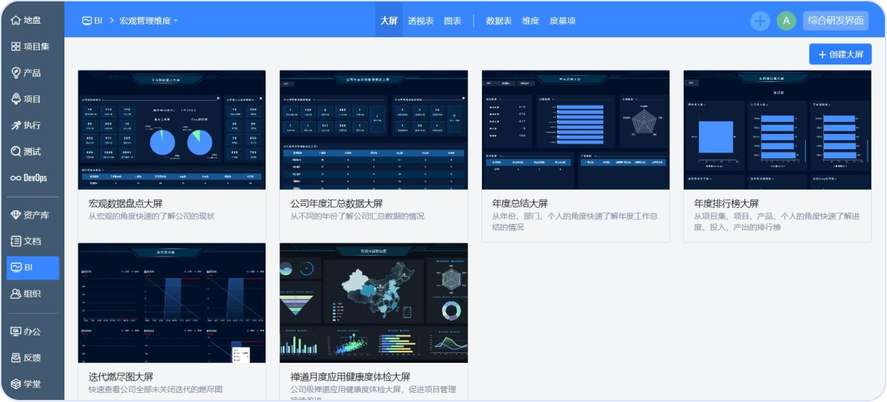 2023年,我们对BI模块中的大屏、透视表、图表、数据表进行了全面地升级,解决用户查询难、做表难、可视化难、分析难的问题。内置海量度量项,支持图形化展示;实现维度、数据表、图表、透视表、大屏的前台展示、后台设计;内置宏观、效能、质量3个管理维度、9个大屏数据。让项目管理和产品管理更加直观高效。