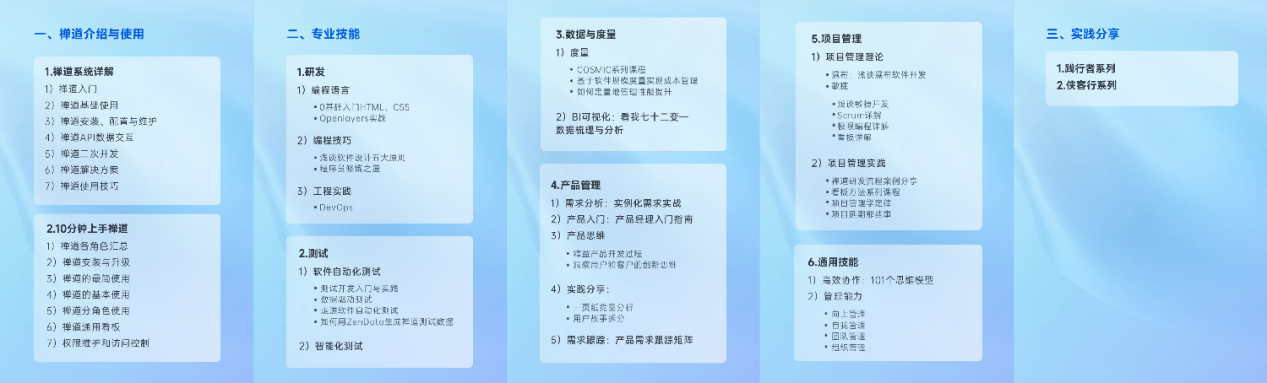 目前,禅道的学堂课程体系包括禅道的介绍与使用、专业技能、实践分享三大板块,帮助大家持续学习,不断提升。此外,禅道还提供了【实践库】功能,内置一整套系统、完整、落地的推荐实践集,解决项目落地遇到的各类问题。