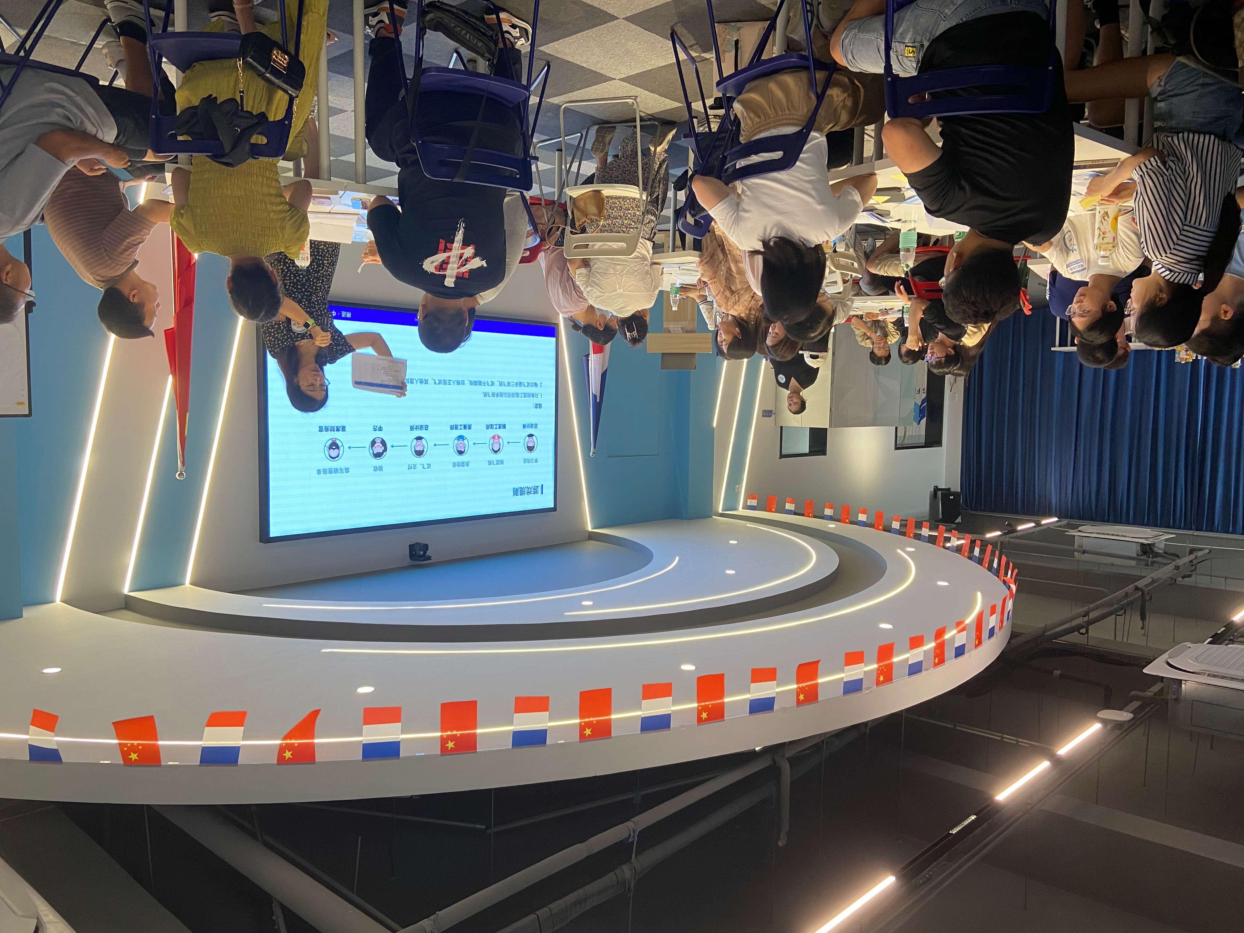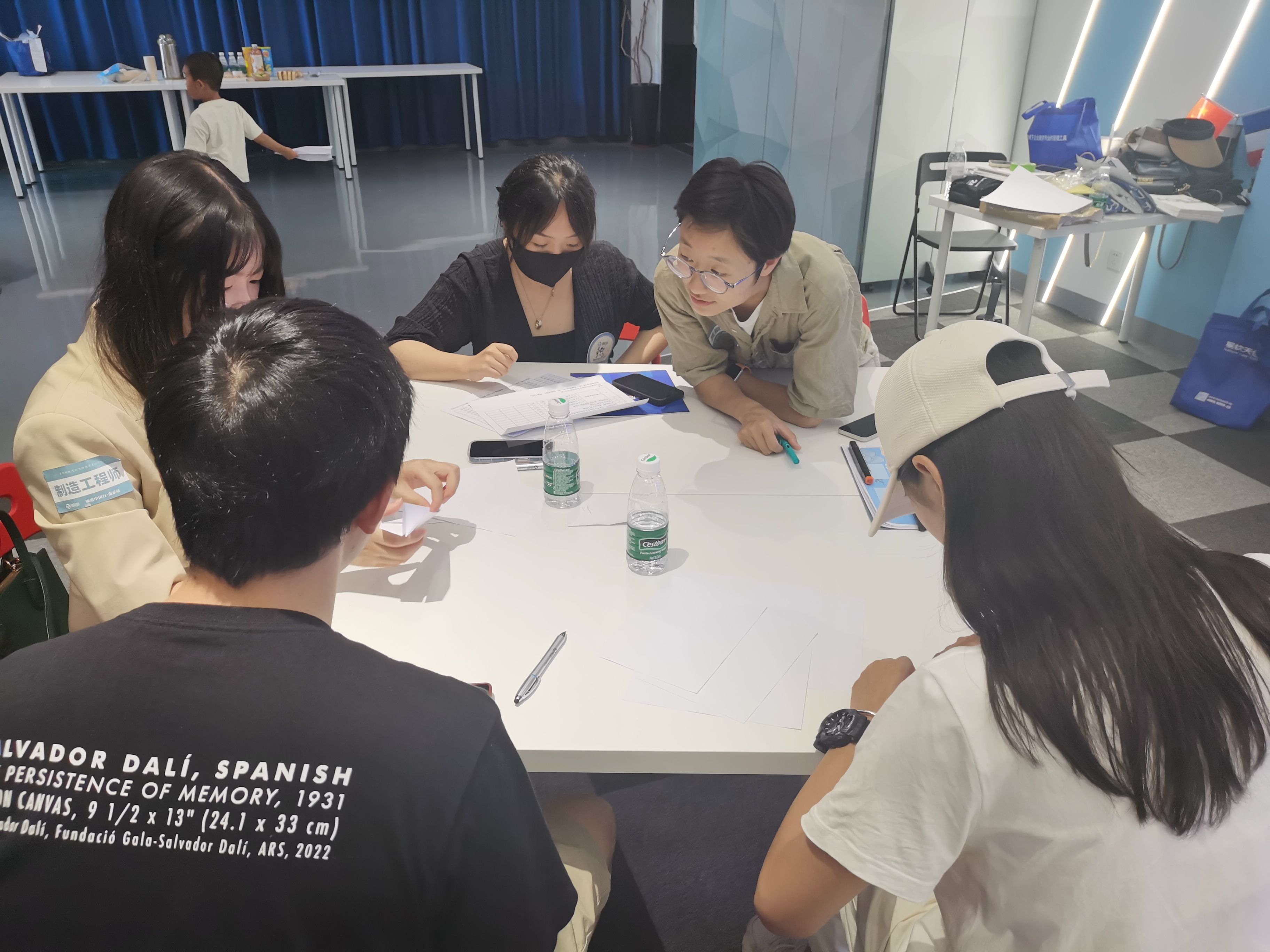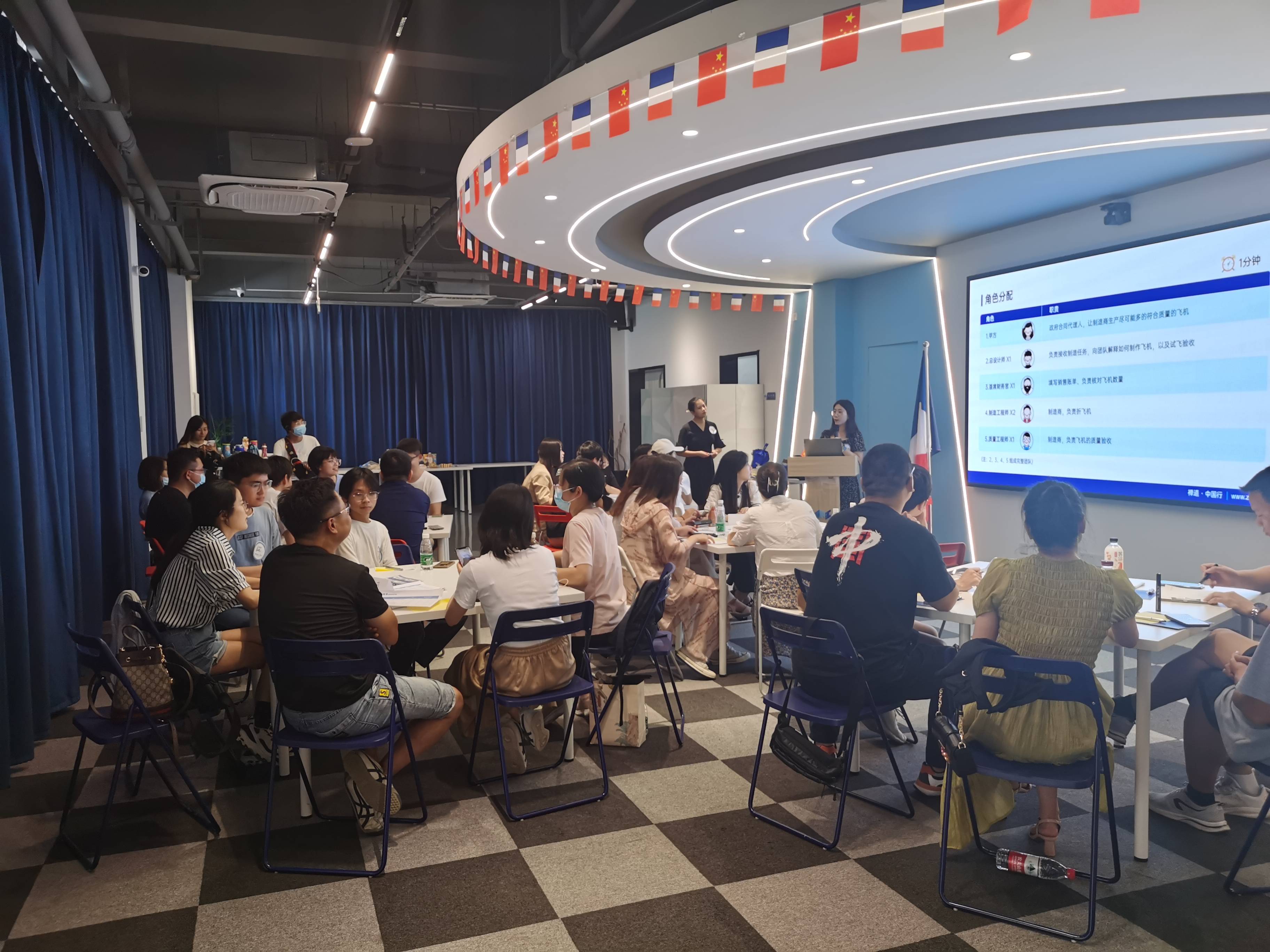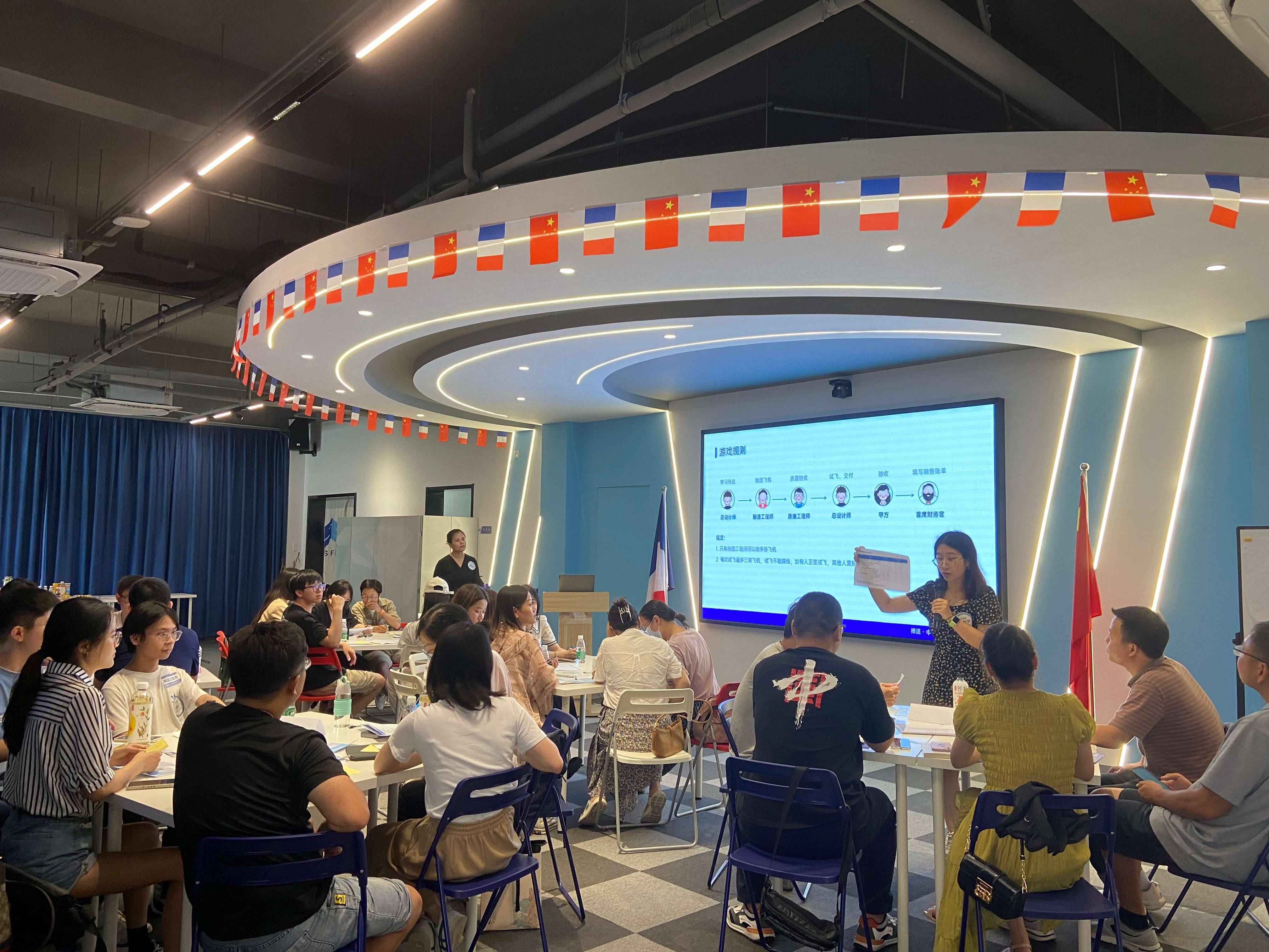 (大家在认真听讲师讲解纸飞机游戏规则)