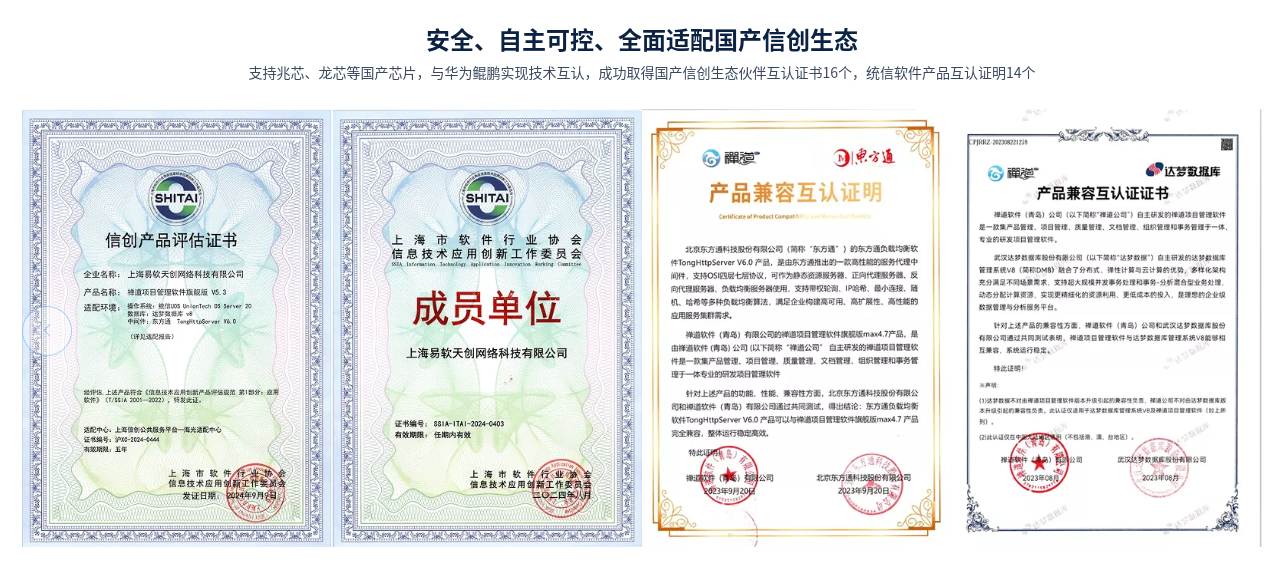 禅道项目管理软件支持兆芯、龙芯等国产芯片,与华为鲲鹏实现技术互认,成功取得国产信创生态伙伴互认证书16个,统信软件产品互认证明14个,打造安全、自主可控、全面适配国产信创生态。