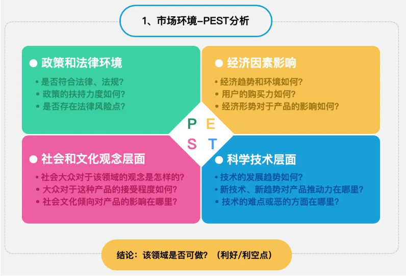 1. 环境分析:采用 PEST 分析法,对市场环境进行概括描述,评估环境变化可能给产品线带来的影响,只考虑对业务真正有意义的事件。