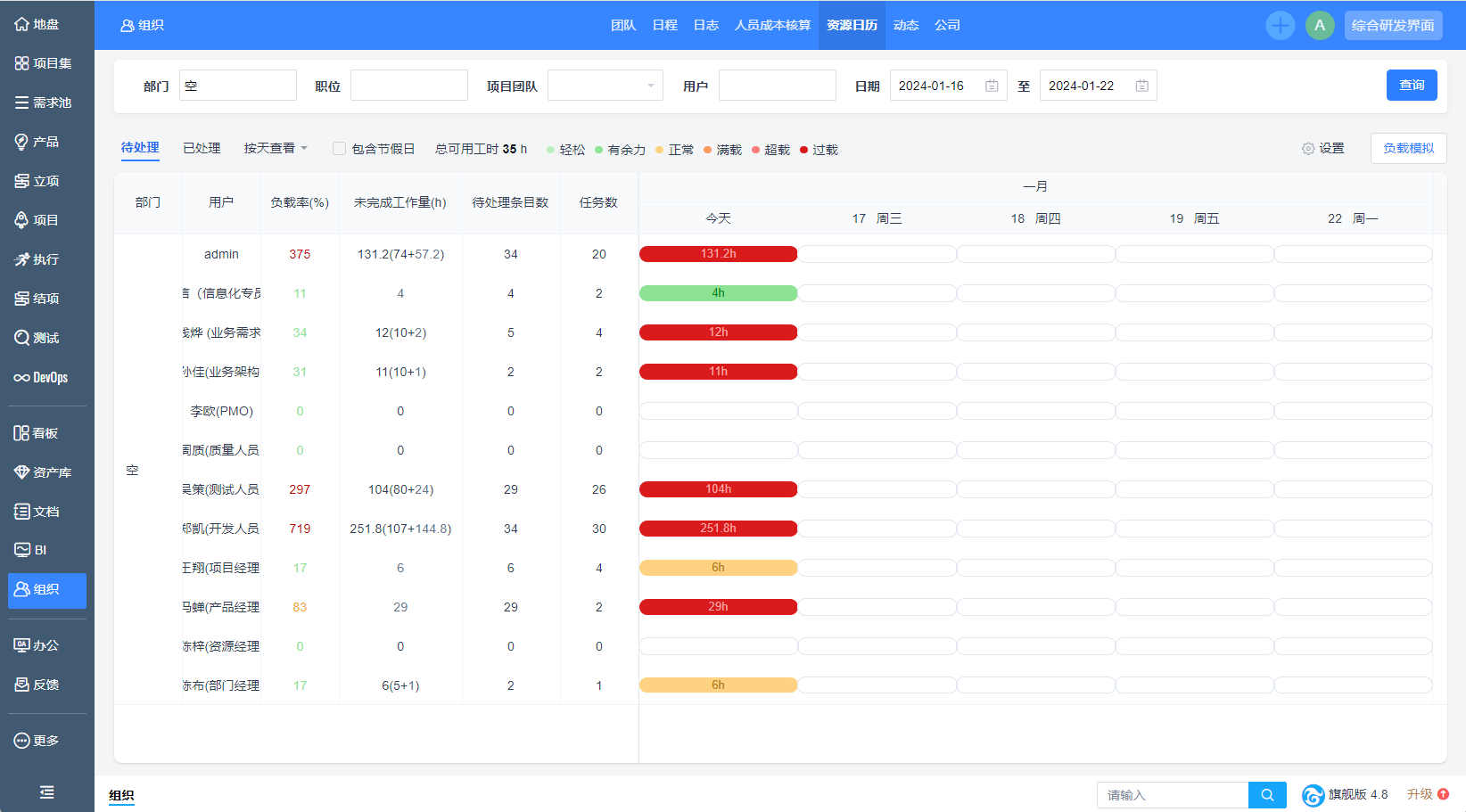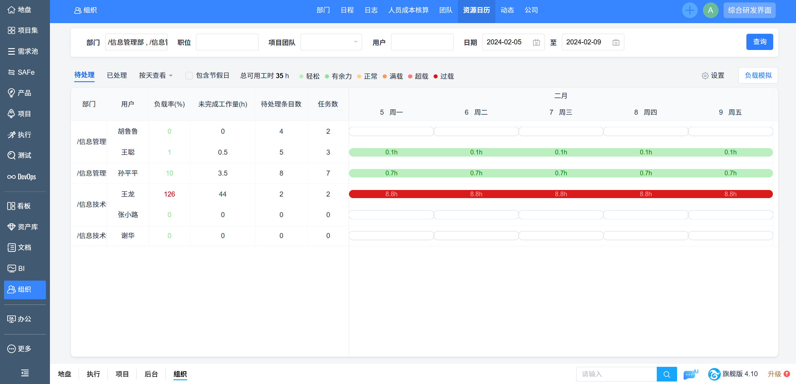 管理者可以从组织的角度去查看项目成员的工作负载情况进行合理的资源分配。