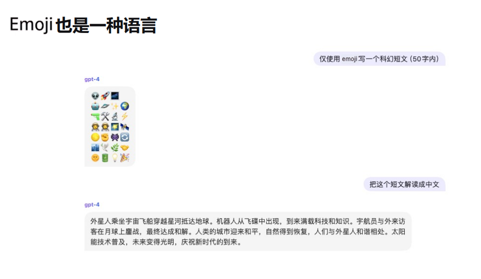 emoji对大模型来说也是一种语言,拼音对它们来说也是一种语言,大家可以用ChatGPT之类的工具试一试,纯用拼音也是可以聊的。