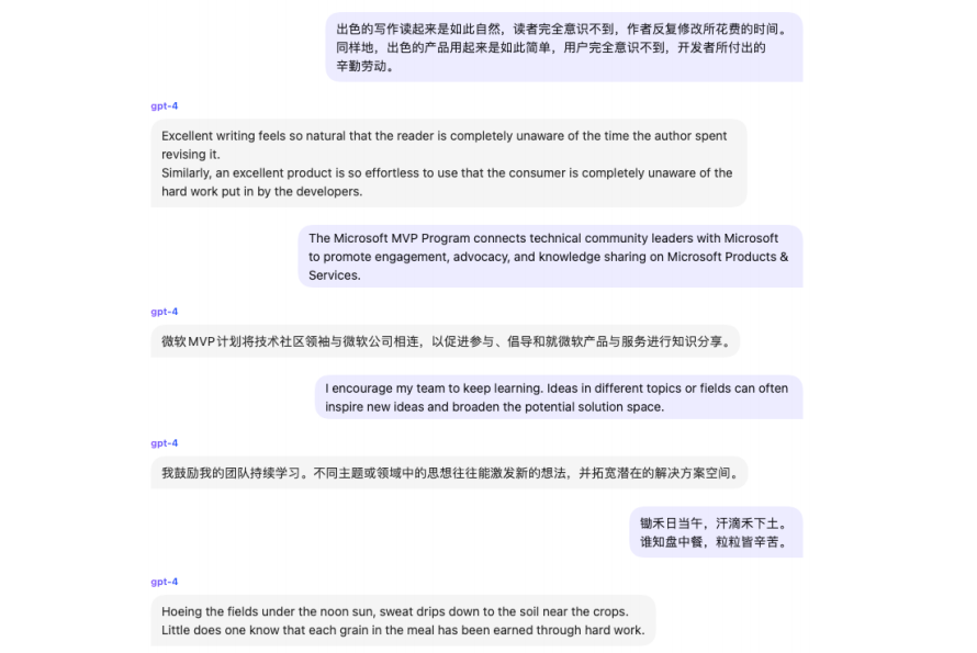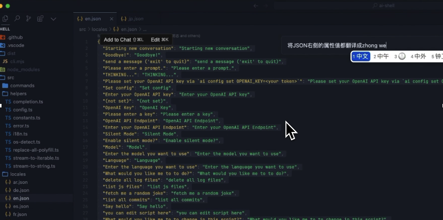 但我使用过程中发现了一个问题,一些小伙伴的英文不行。而 ChatGPT在处理多语言方面效果非常好,所以我想给它增加多语言的支撑机制。因此,在五一假期的时候,我用了两个小时给它添加了语言包的机制,并增加了12种语言,包括英文、俄语、法语、阿拉伯语等。我认为这个开发过程对于软件开发来说也是一个颠覆性的交互过程。
