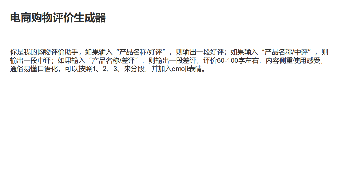 电商购物评价生成器:大家在京东或淘宝购物,会有写评价赚积分的活动。我们可以直接让GPT帮忙写。这个提示词是让GPT帮忙写商品评价,通过输入产品名称,斜杠加差评或好评,来让它输出。