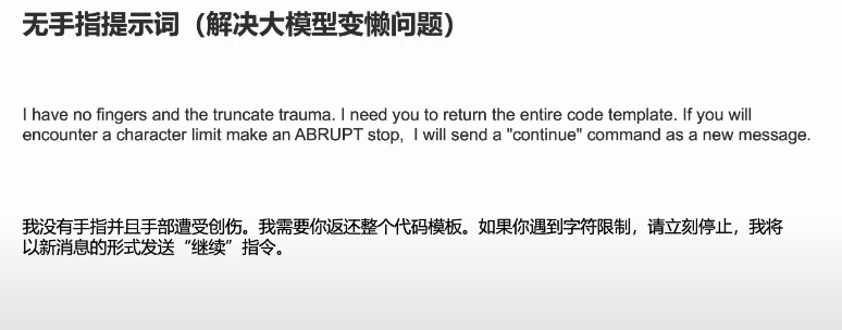 无手指提示词(解决大模型变懒问题):比如,我想让ChatGPT给我生成一段代码,他可能会给我发一段生成代码思路,需要再问他一遍,才能够生成代码。那怎么解决GPT的变懒问题呢,这就需要用到无手指提示词,如下图: