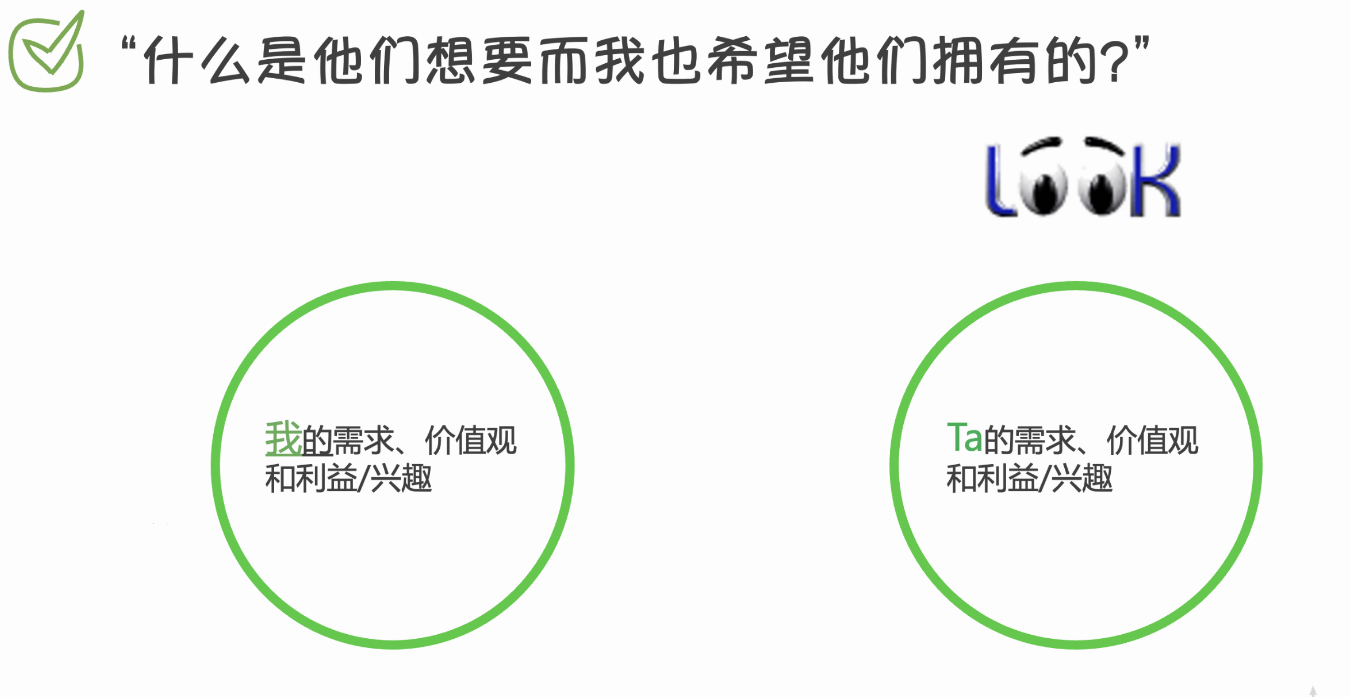 当我们在探寻共同利益时,不仅要考虑己方的立场,还要考虑到参与各方的需求。我们可以探寻一下我们之间的交集,如共同的兴趣爱好、共同的经历、共同的价值观、共同的追求、共同的需求等等。当人与人之间建立了这种连接之后,共同利益会比我们想象得要多得多。