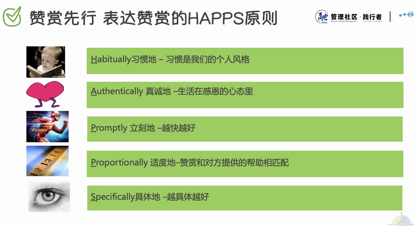 要真诚地、习惯地、立刻地、适度地、具体的表达赞赏。即便对方的行为可能不那么有效,但如果他的发心是善意的,也要赞赏他的发心。