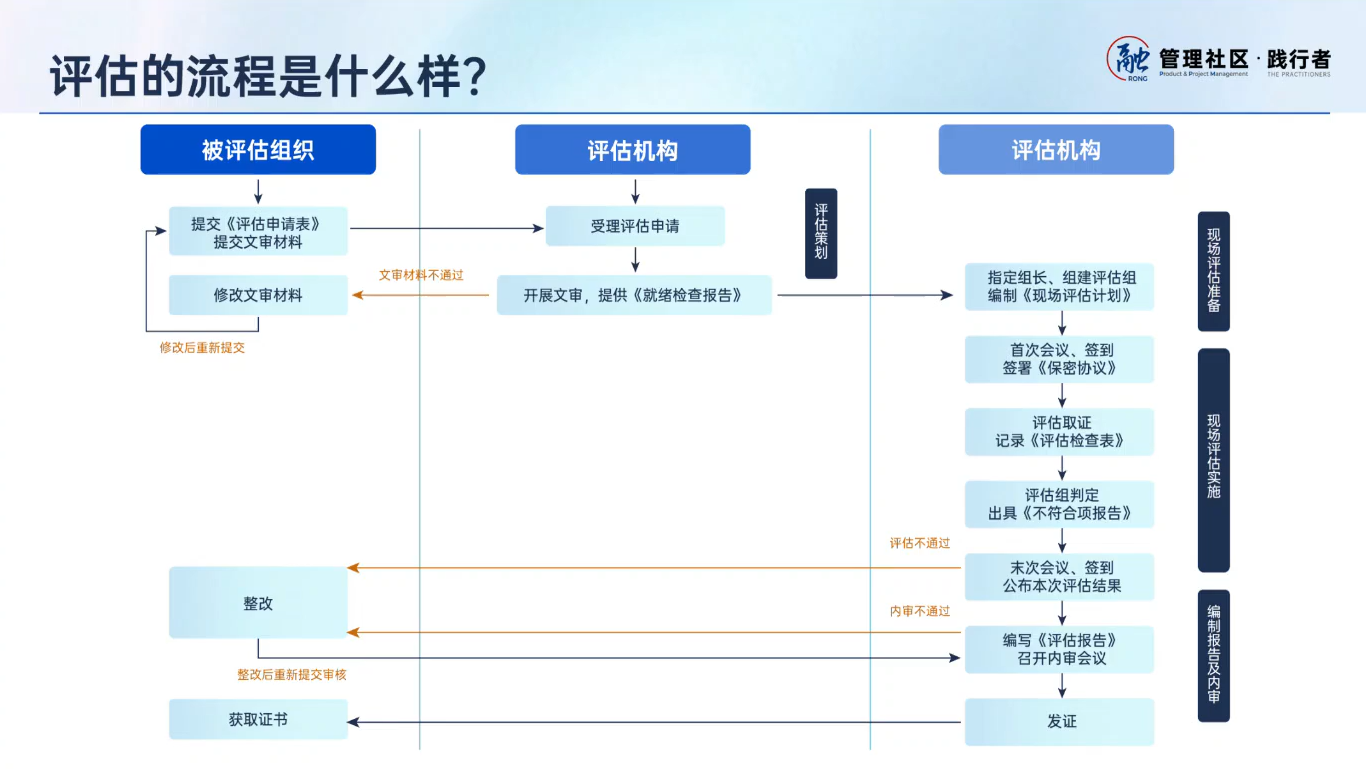 如果一切顺利,预评估通过后,我们会在三周到一个月之内组织正式评估。拿三级来举例,在正式评估中,预计是三个人、四天左右的工作量。正式评估完毕后,如果评估通过,会有内审加写评估报告的过程,大概一个月。