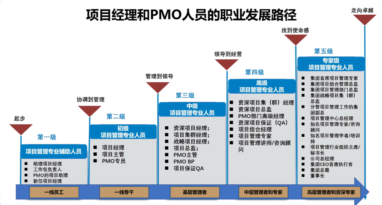 - 第五级:专家级项目管理专业人员。不仅仅要干成项目,还要对自己所在的组织、企业、政府等进行组织能力建设,对其进行赋能,通过组织环境的成熟营造和组织能力的建设,让更多项目经理能够将项目成功落地。