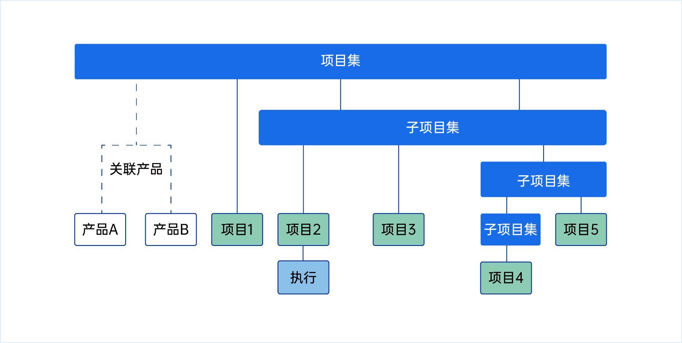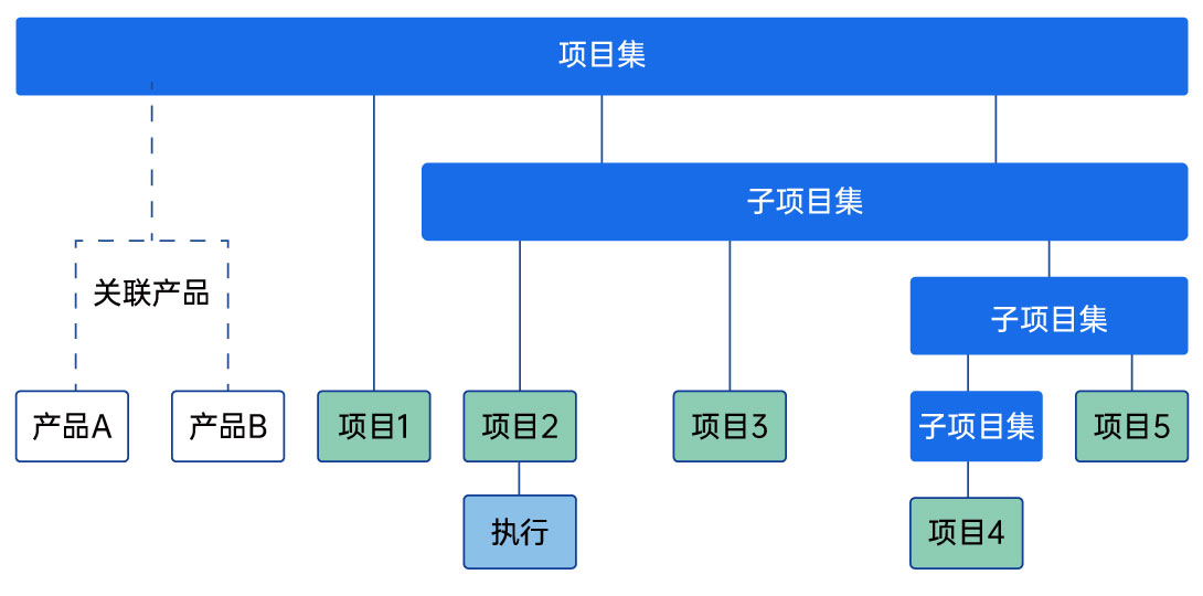 如图所示,项目集的层级最高,在它下面可以管理一个或多个子项目集、产品和项目,产品只能关联到顶级项目集下。