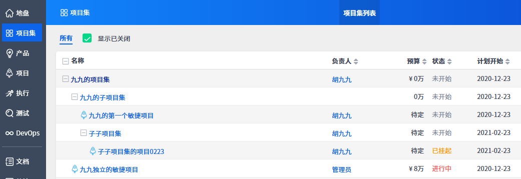 禅道支持项目集的管理方式,在一个项目集下可以有多个子项目集或项目,同时还支持严格的权限控制,确保管理方式的灵活和数据安全。