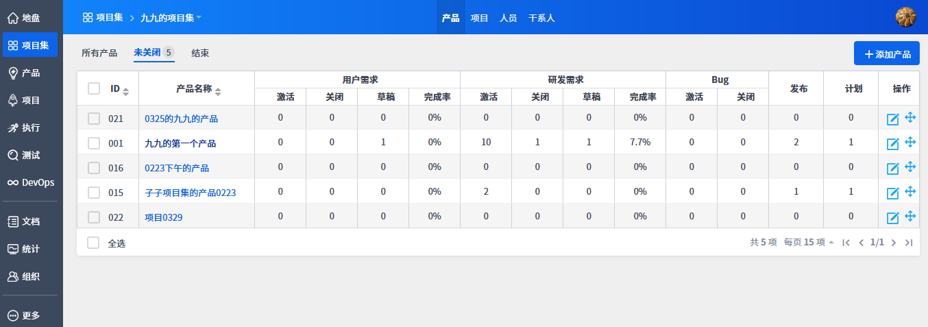 项目集的展示方式有列表和看板两种形式,可以通过列表或看板直接查看产品项目的数据、进展情况。