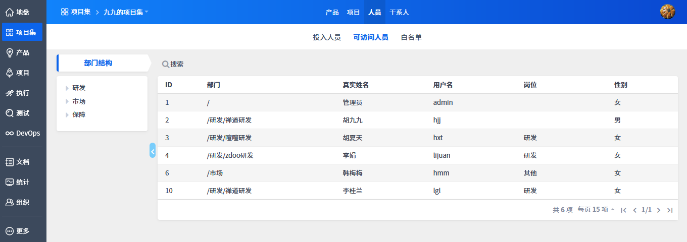 点击项目集名称, 可以查看到项目集下的产品、项目、人员(投入人员、可访问人员、白名单)、干系人信息。