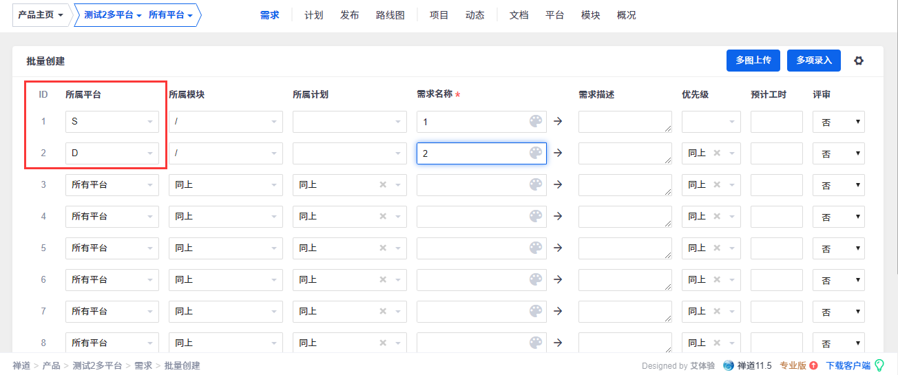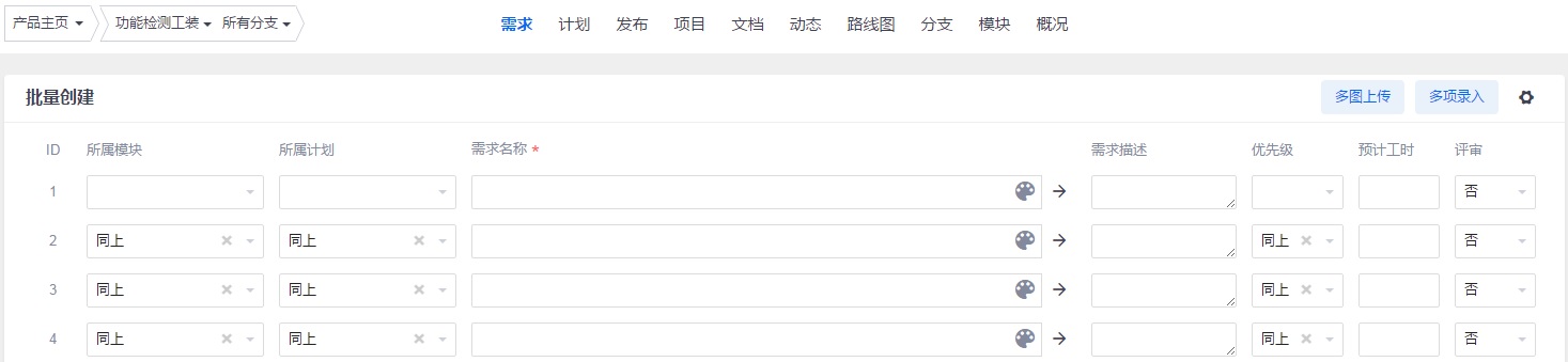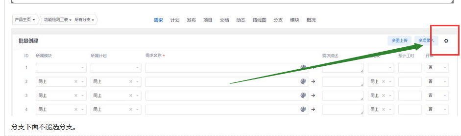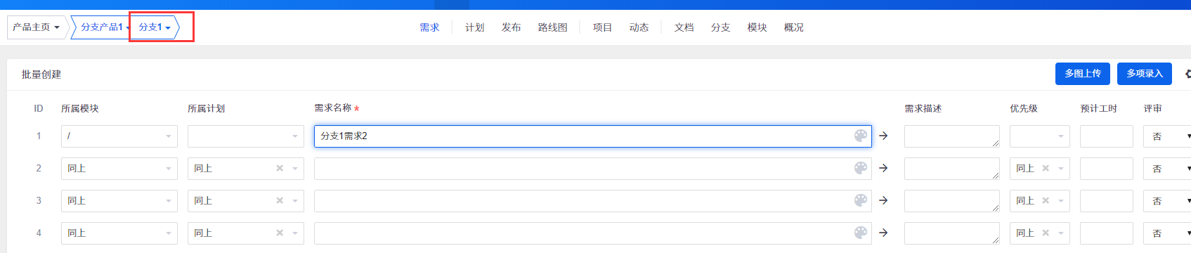 在产品的分支下使用批量输入需求,除第一个需求外,其它需求会被放在产品的所有分支下。