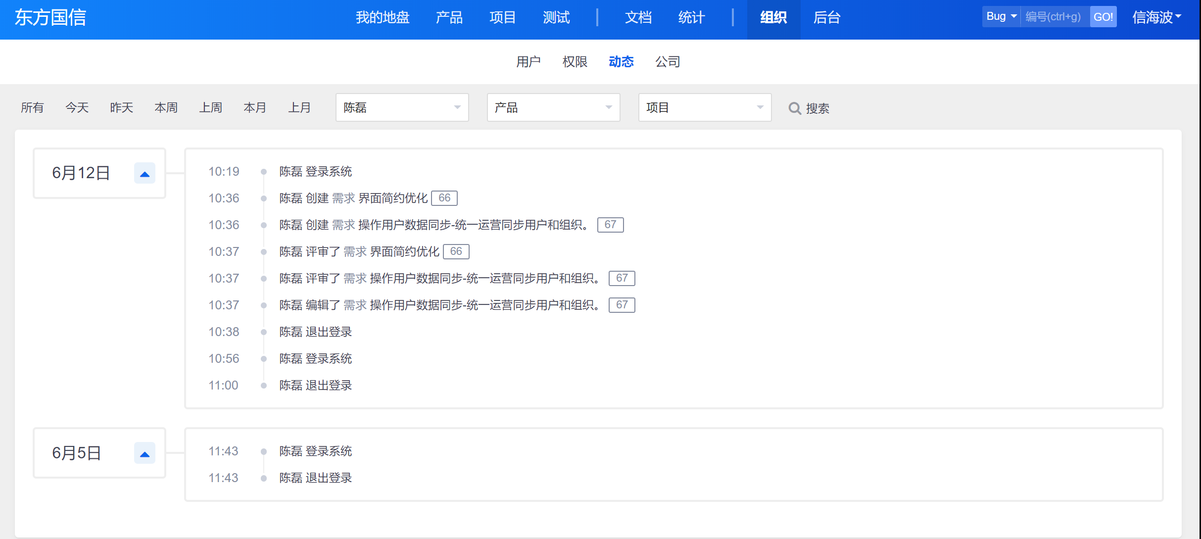 产品、项目 分隔开了, 但是从动态中 可以筛选用户, 然后看其他部门的动态,然后点击详情 查看, 这算是BUG吧