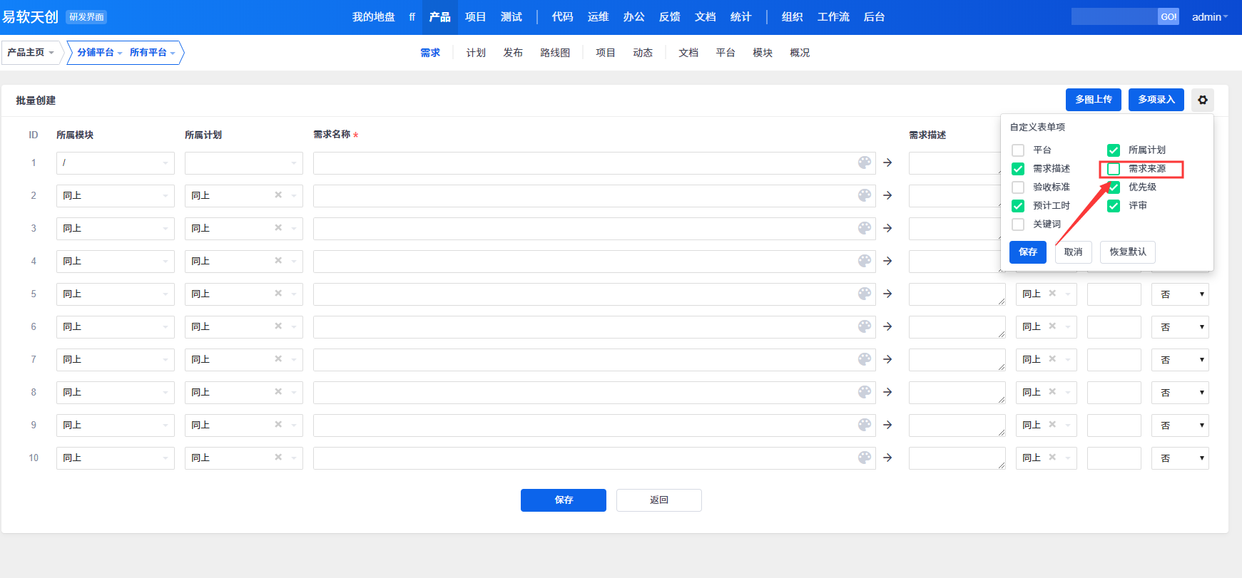 产品-需求-批量创建,自定义表单项能不能把需求来源这个字段加上