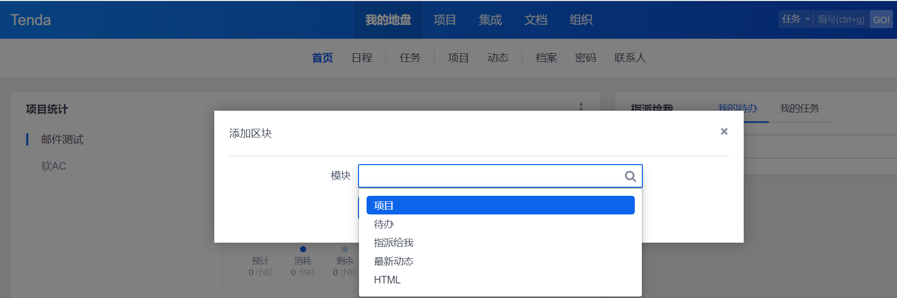 用户能够显示今天剩余工作总计 这块是在我的地盘下 - 首页 - 区块中展示的