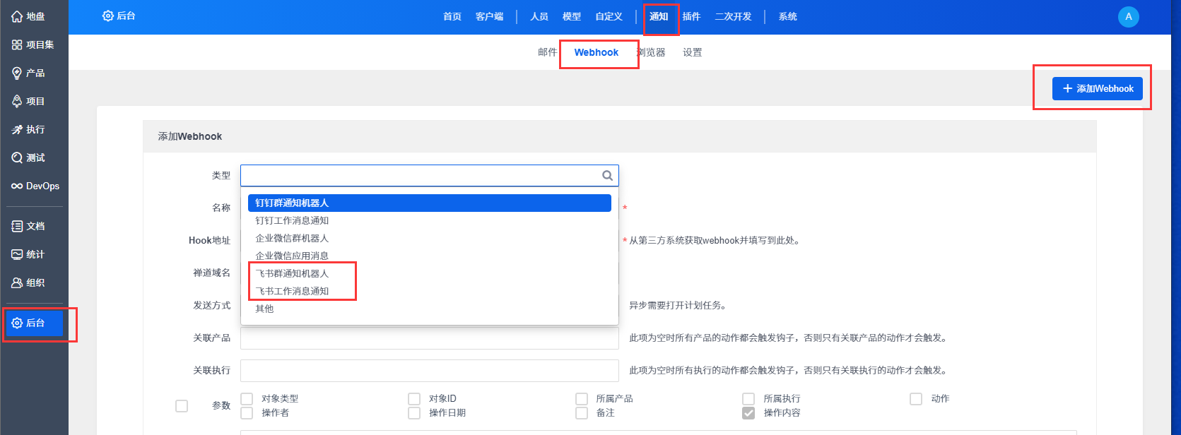 可以看下飞书有没有相关的webhook文档,在禅道中配置下