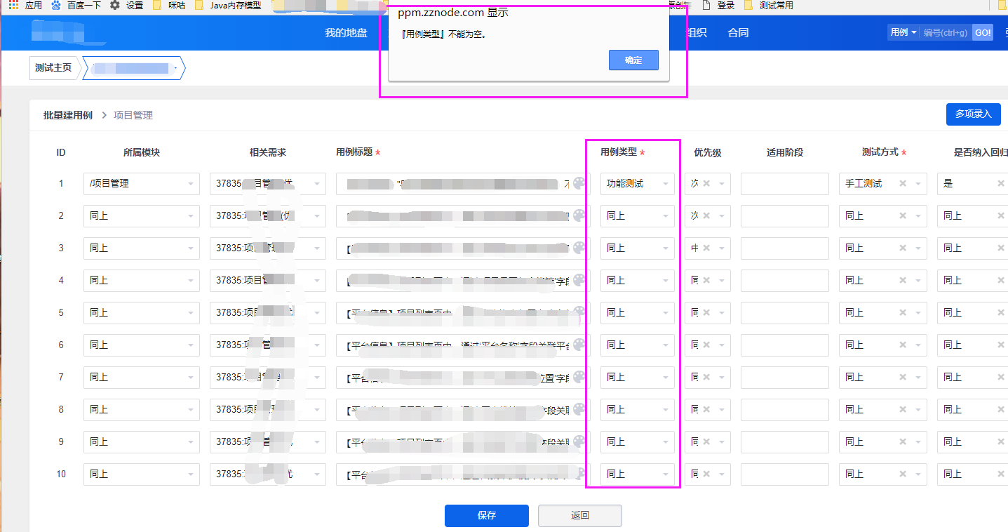 在项目中批量建用例,必填的信息都填了,提交保存的时候一直在提示‘’【用例类型】不能为空‘’,严重影响使用啊!!!