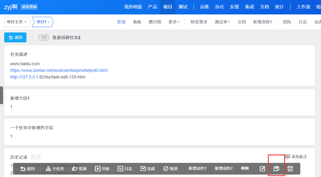 点击任务标题,页面下方有复制按钮,可以复制任务后,将任务类型改为 测试 ,来创建测试任务。如果未看到复制按钮,可以在组织--权限--权限维护页面,给用户所在分组添加权限后重新登录看一下。