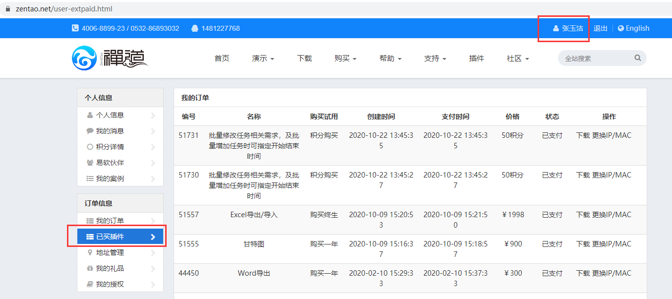已购买的插件一般是在个人中心--已买插件页面来查看和下载的。方便的话可以可以添加网页上方QQ,截图看一下具体购买的哪个插件,将多扣积分返还。