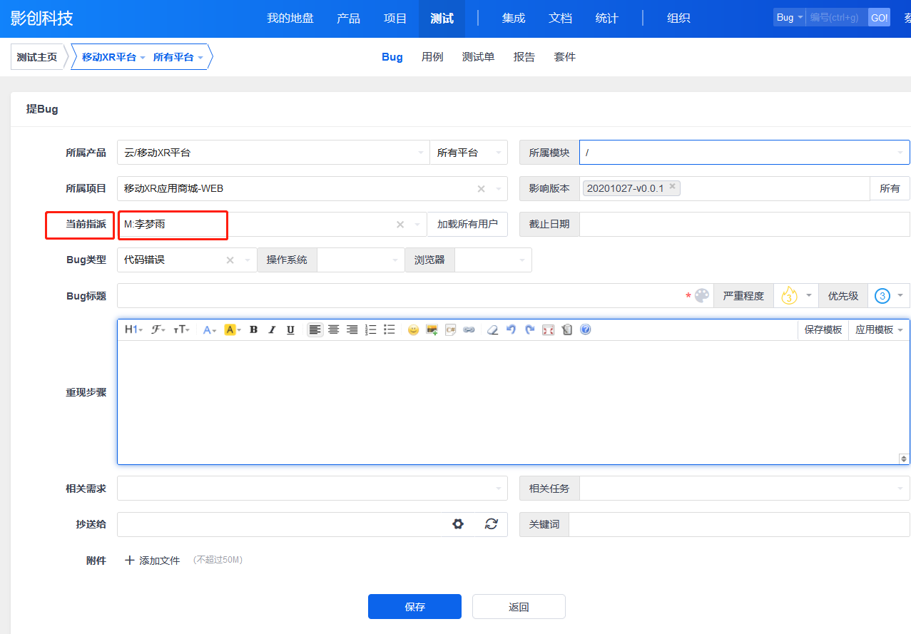 提交bug指派人显示规则:选择模块后会显示模块负责人(模块负责人必须在下拉列表中有才能显示,没有模块负责人会显示产品中的测试负责人。)未选择所属项目会列出最近的一个项目的团队成员,选择所属项目后 指派人会显示选择的 项目的团队成员,点击 加载所有用户 按钮显示全部成员。