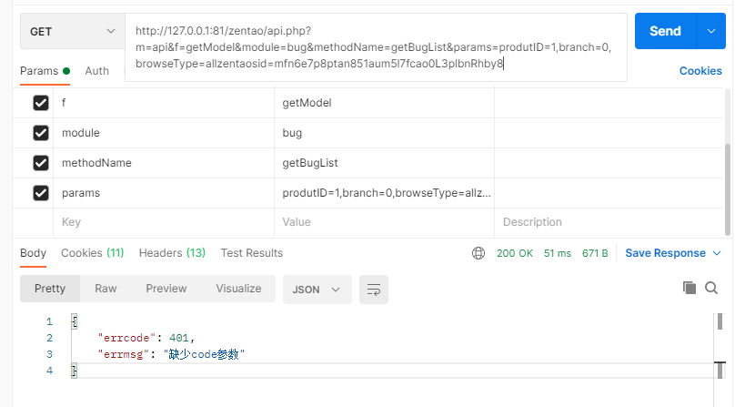 获取当前bug列表,api调用地址http://127.0.0.1:81/zentao/api.php?m=api&f=getModel&module=bug&methodName=getBugList¶ms=produtID=1,branch=0,browseType=allzentaosid=mfn6e7p8ptan851aum5l7fcao0L3plbnRhby8