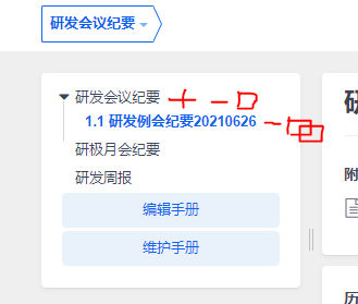 其中,手册名和章节名旁边可增加三个符号,分别是“+”、“-”和一个代表新增文章的符号,分别代表"创建下一级章节"、“删除本章节”以及“在本章节增加文章”;在目录条目中的文章名的旁边增加“-”和"复制"符号,分别代表“删除本文章”和“根据本文章复制新的文章”。