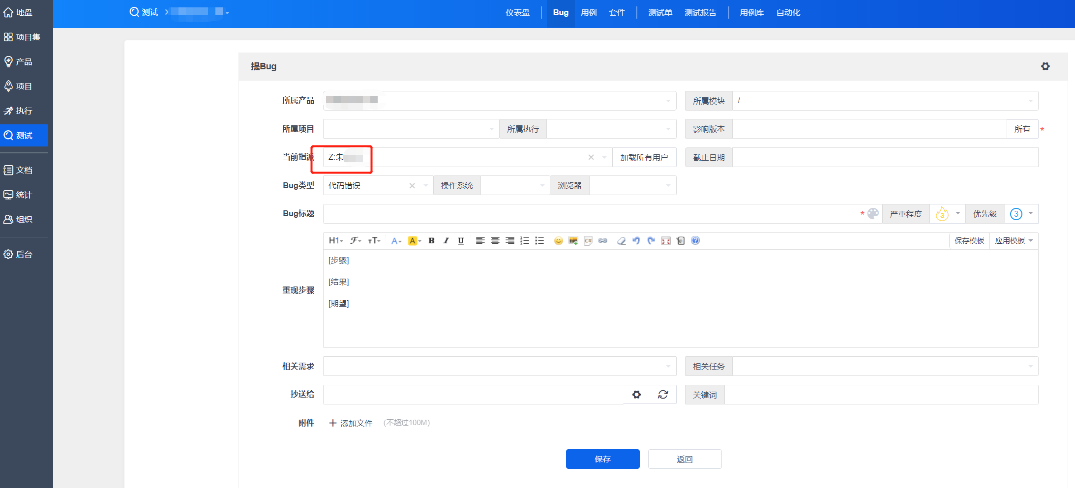 选择模块后会显示模块负责人(模块负责人必须在下拉列表中有才能显示,没有模块负责人会显示产品中的测试负责人。)未选择所属项目会列出最近的一个项目的团队成员,选择所属项目后 指派人会显示选择的 项目的团队成员,点击 加载所有用户 按钮显示全部成员。