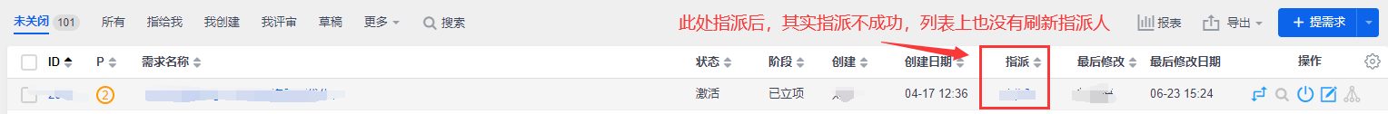四、在需求详情界面下方指派后,需求列表上也没有更新指派人姓名